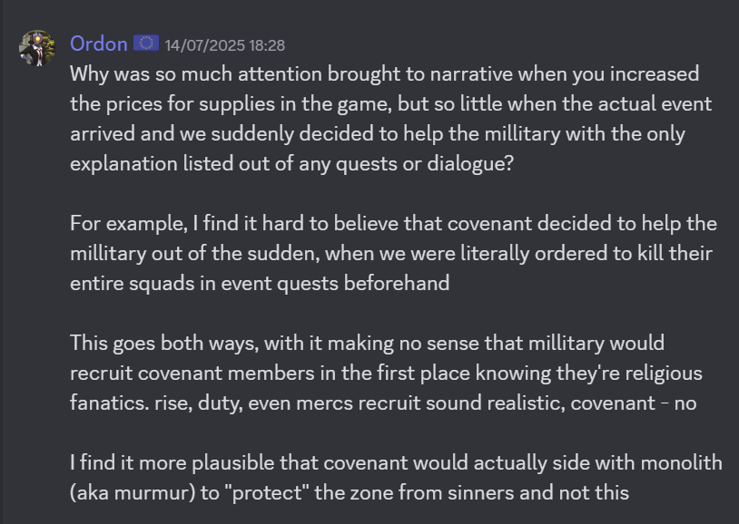 Frozen_Light: It is important to distinguish between preparation and the event itself. The preparations affected the entire Zone and the entire Open World. It had to resonate with people and engage them, so many aspects of the narrative's impact were worked out and detailed. In turn, when the event directly related to military assistance began, the gameplay of the separate event took priority, so it was necessary to create a narrative that would complement the main gameplay without distracting attention from it. Again, did you listen to the propaganda of Murmur? In every word there is truth/form/essence/understanding.