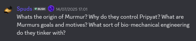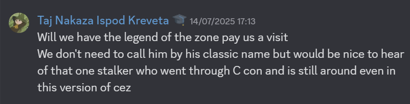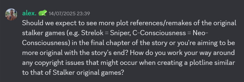 Frozen_Light: Let's start with the fact that we don't use Stalker's plot paths. Furthermore, references to original entities with altered names tend to have the status of legendary, semi-mythical events that almost no one remembers. Yes, some fan service will pop up one way or another, but in extremely homeopathic quantities. We have our own world, our own universe.