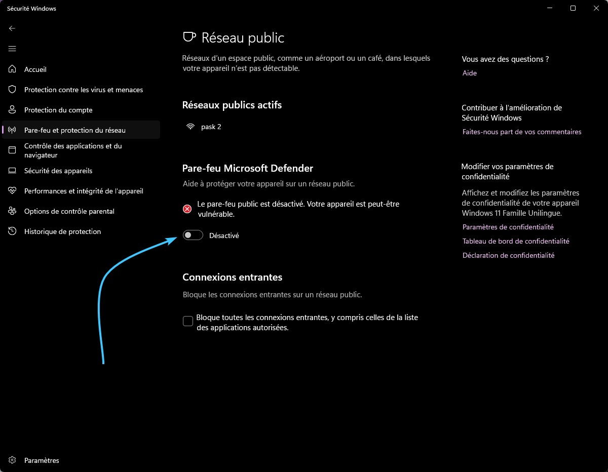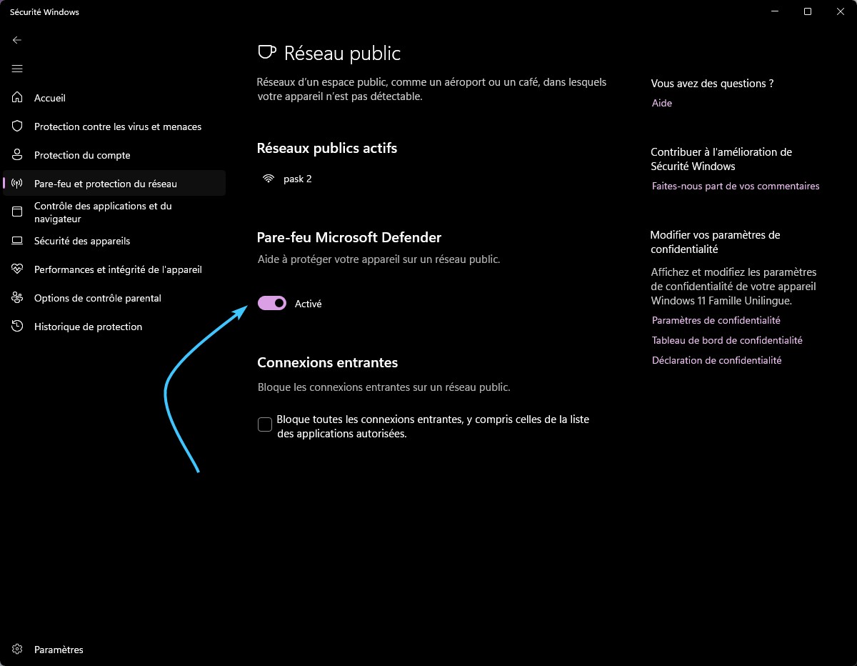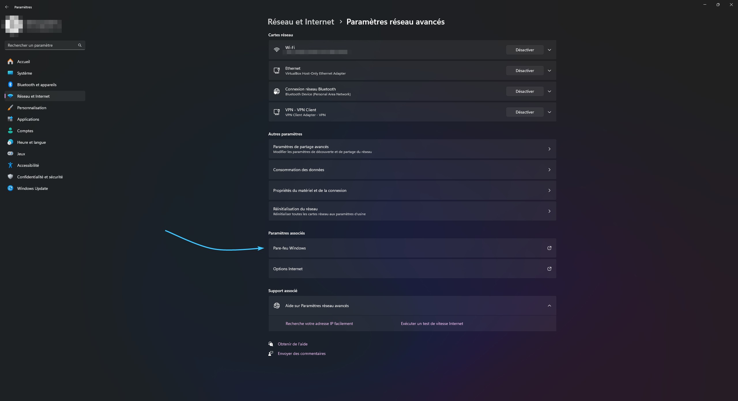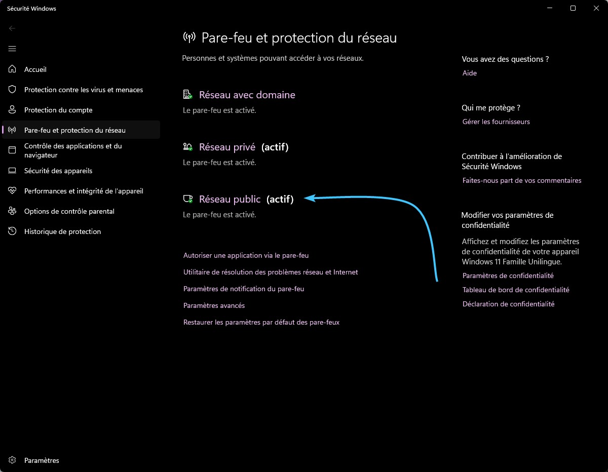 4. Ouvrez la section du composant Pare-feu Windows intitulée Actif.