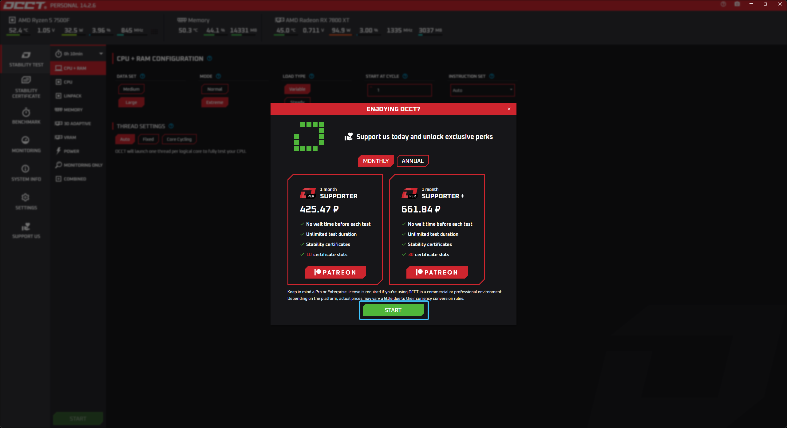 11. Появится окно поддержки. Обратите внимание, что финансовая поддержка для использования данного приложения в личных целях не обязательна. Вновь нажмите кнопку «Start» для запуска.