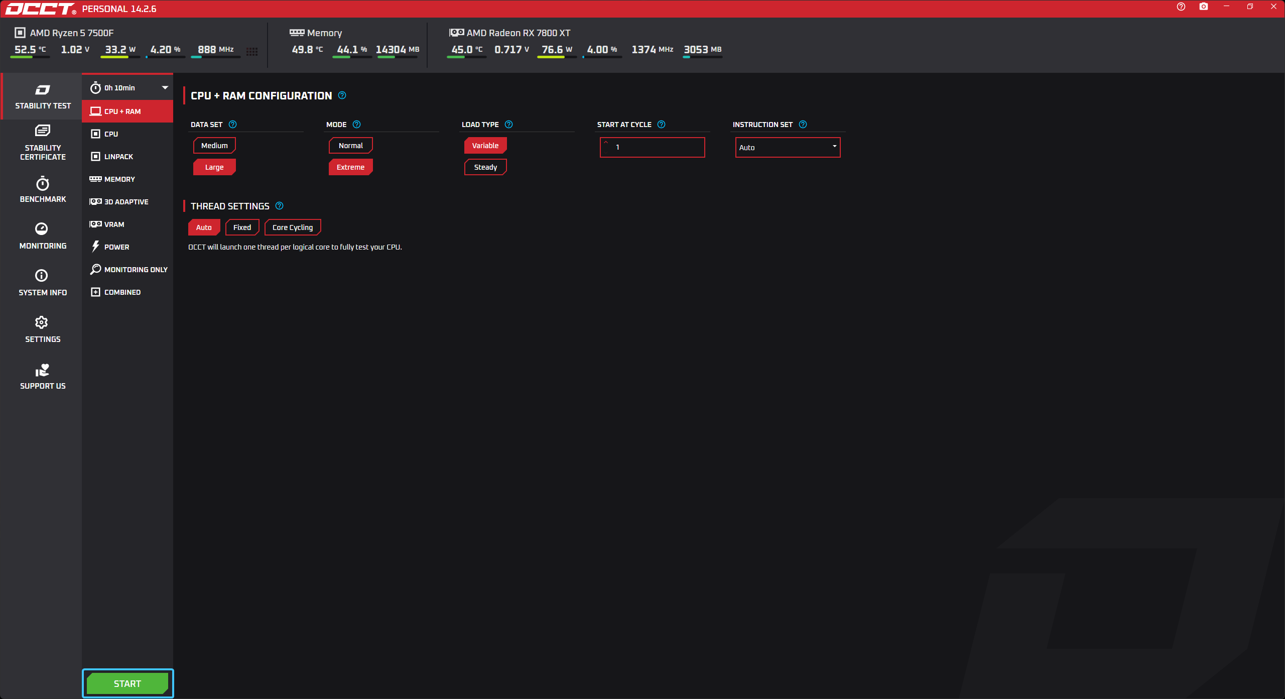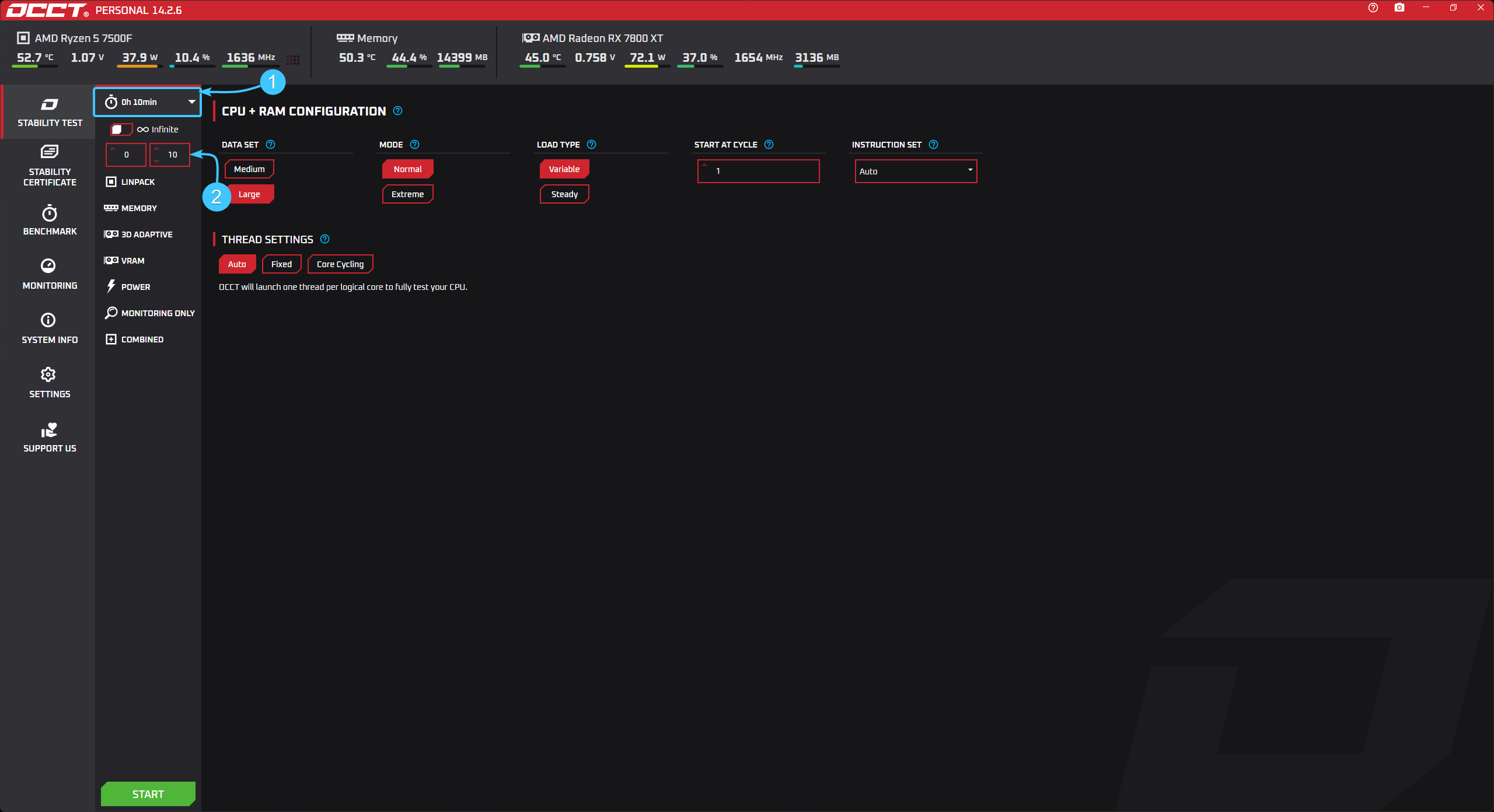 12. После этого, тестирование «CPU + RAM» будет запущено. Дождитесь его полного завершения.