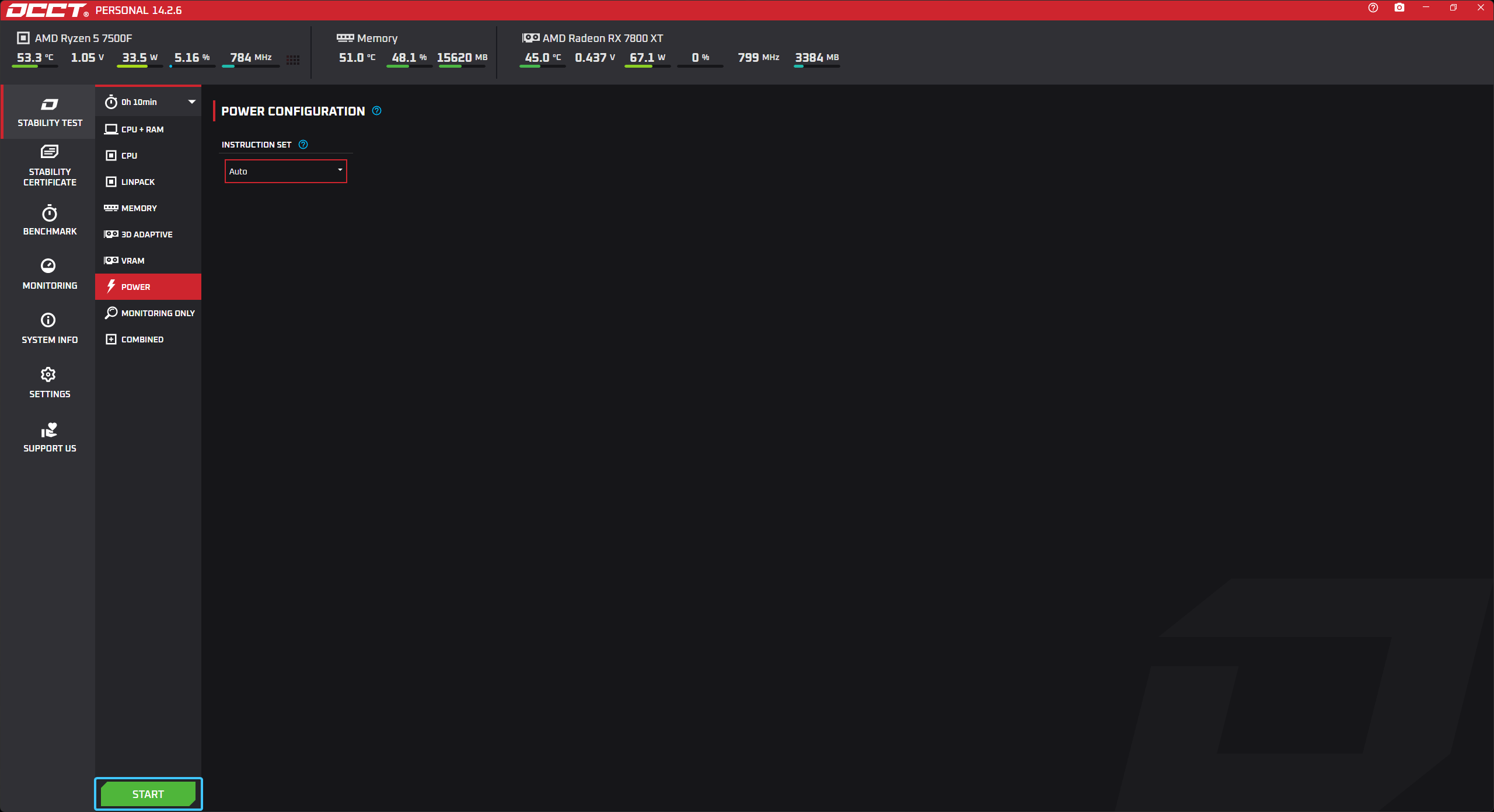 7. Для запуска тестирования нажмите кнопку «Start», которая расположена в левом нижнем углу.