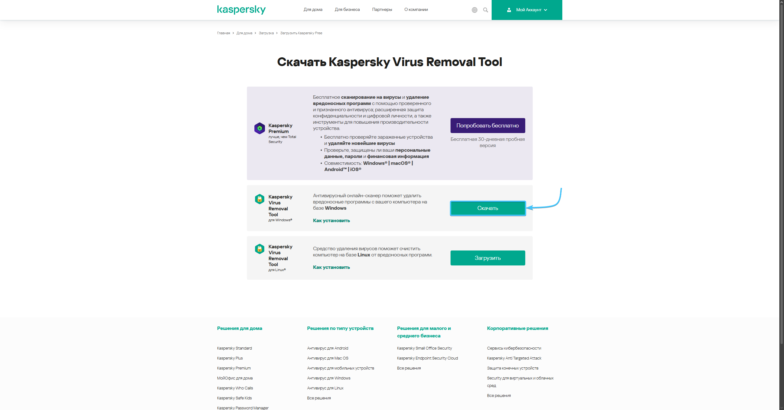 1. Перейдите на страницу приложения «Kaspersky Virus Removal Tool» и нажмите кнопку «Скачать».