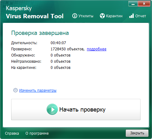 5. Нажмите «Начать проверку». Дождитесь её завершения. Найденные угрозы внесите в карантин.