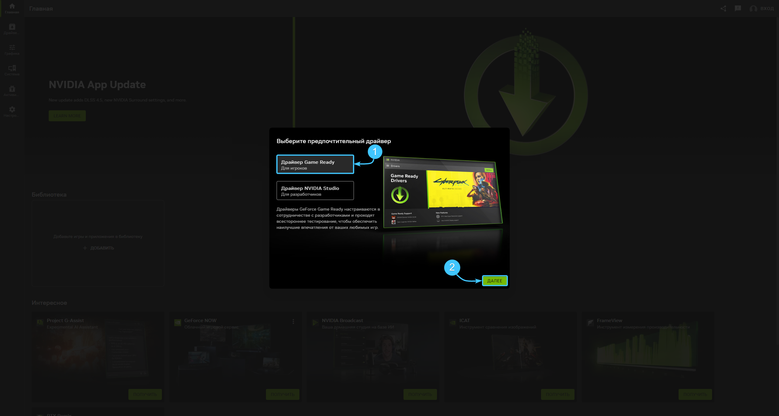4. Выберите вариант «Драйвер Game Ready» (1) и нажмите кнопку «Далее» (2) для продолжения.