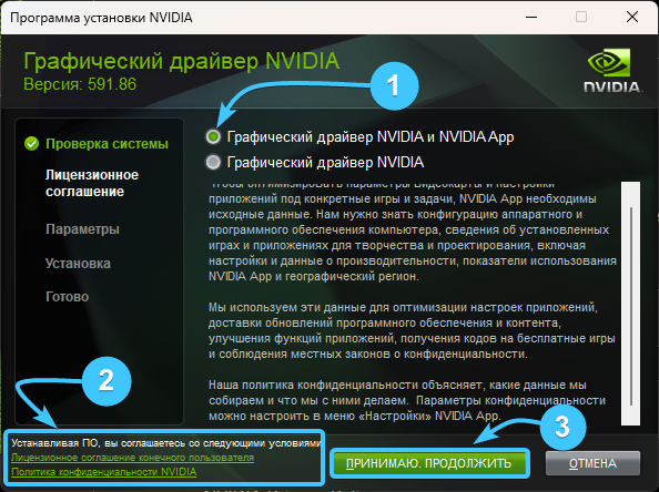 7. Выберите установку драйвера и приложения (1), ознакомьтесь с документами (2) и нажмите «Принимаю. Продолжить» (3).