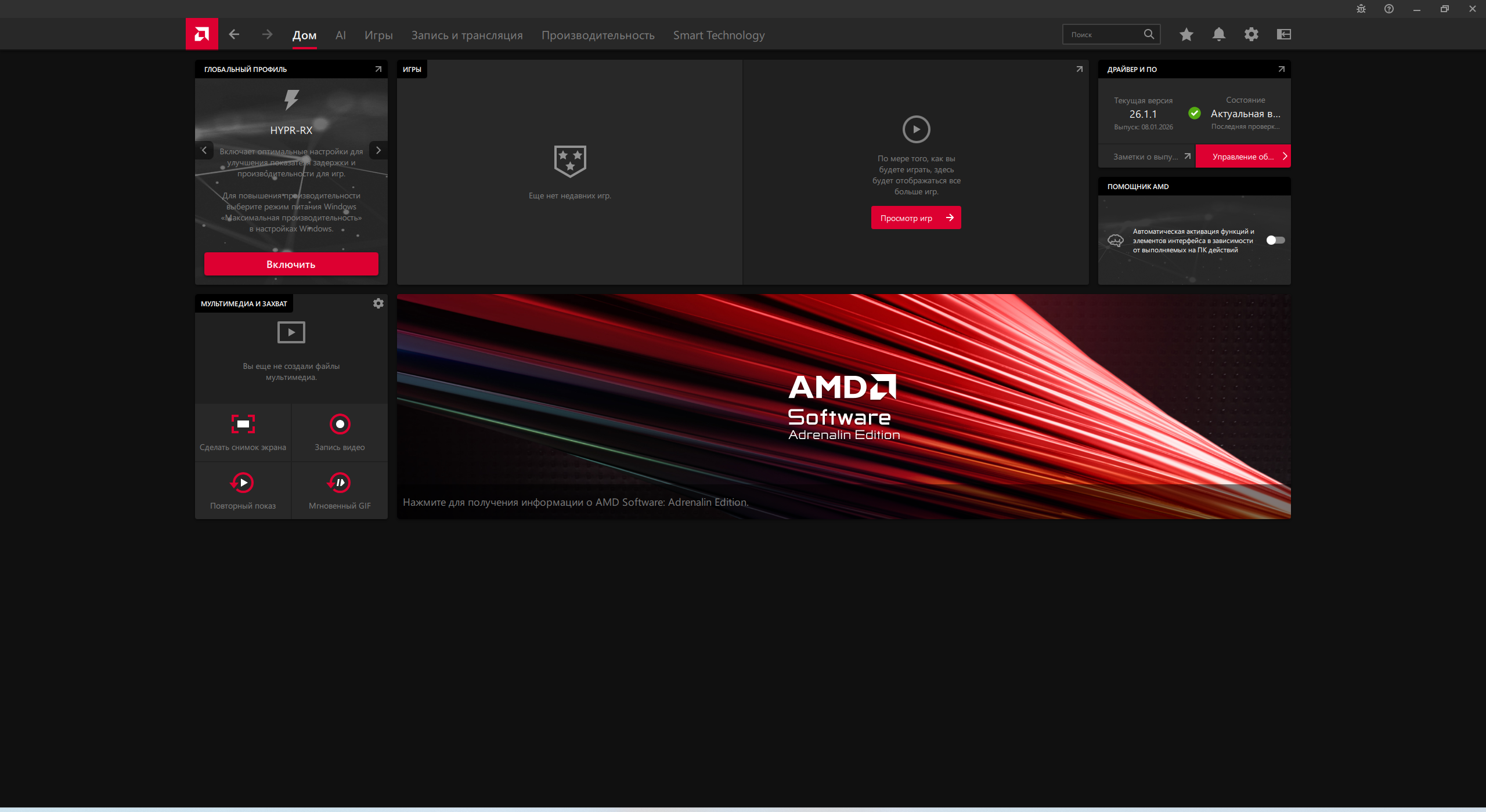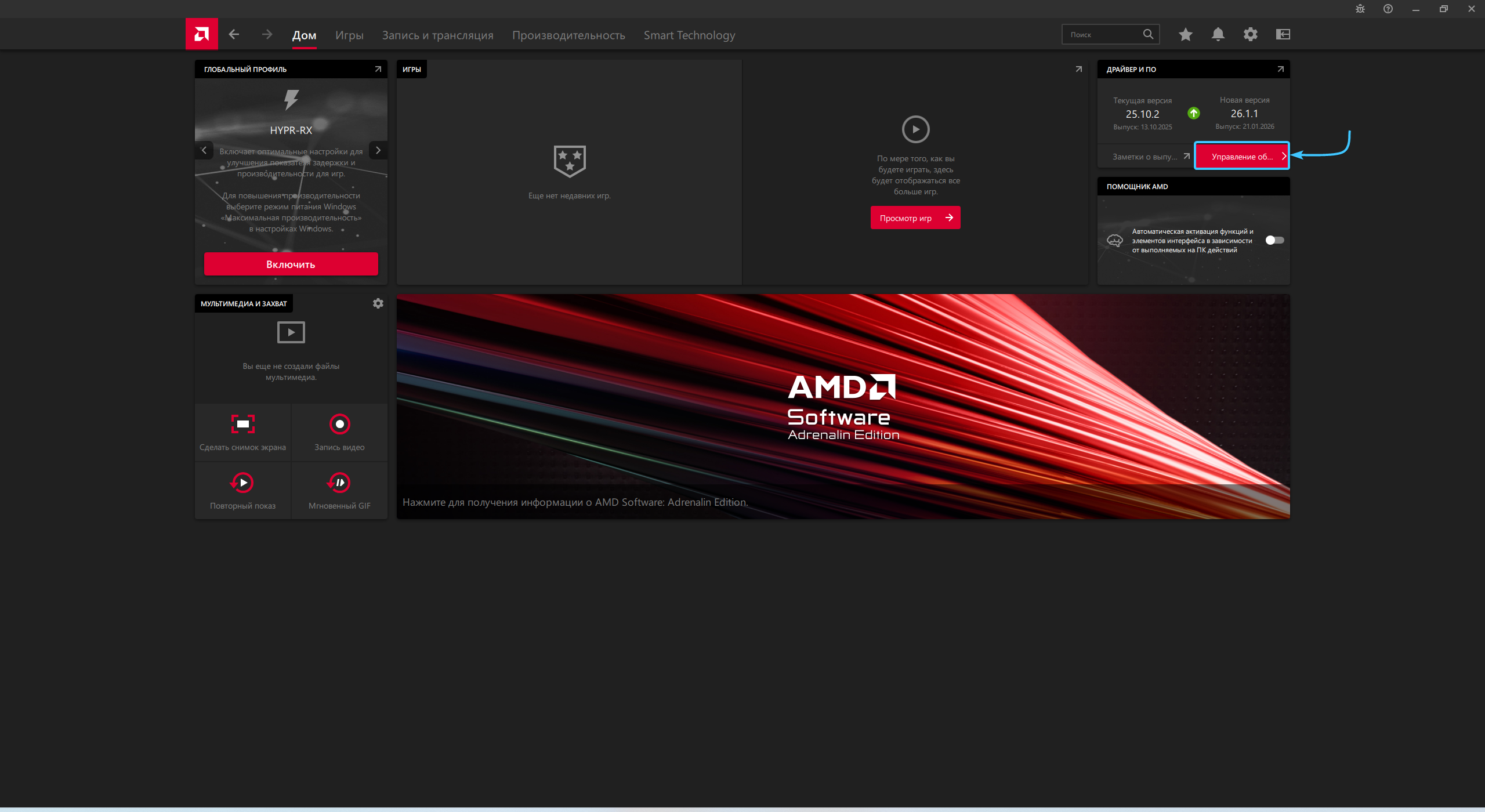 1. Запустите приложение «AMD Software: Adrenalin Edition». Сразу откроется вкладка «Дом». Раздел обновлений будет располагаться в правой части приложения.