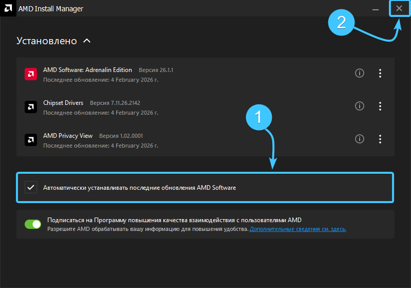 4. Поставьте галочу для автоматическоц установки обновлений (1) и закройте (2) данное окно.