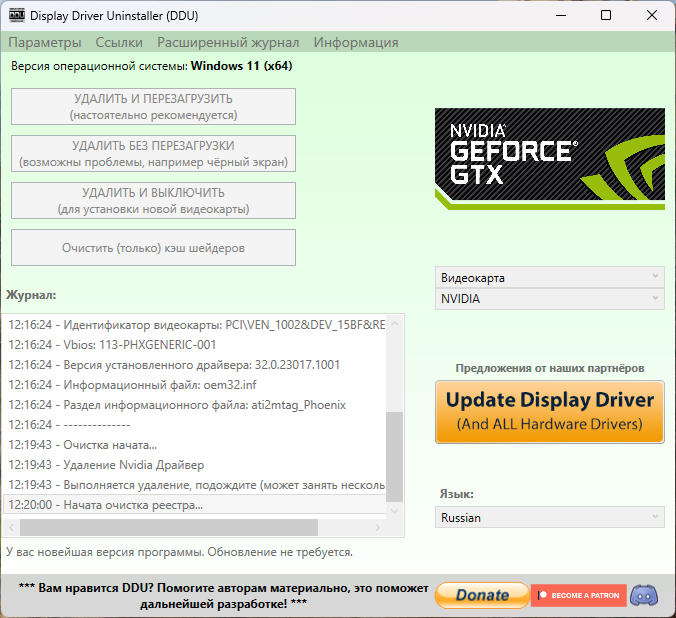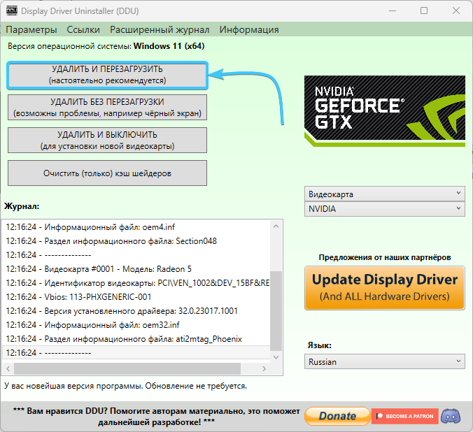 9. Нажмите кнопку «Удалить и перезагрузить». Дождитесь завершения процесса удаления драйверов.