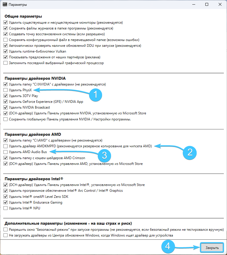 6. Поставьте галочки возле всех параметров удаления драйверов и нажмите кнопку «Закрыть».