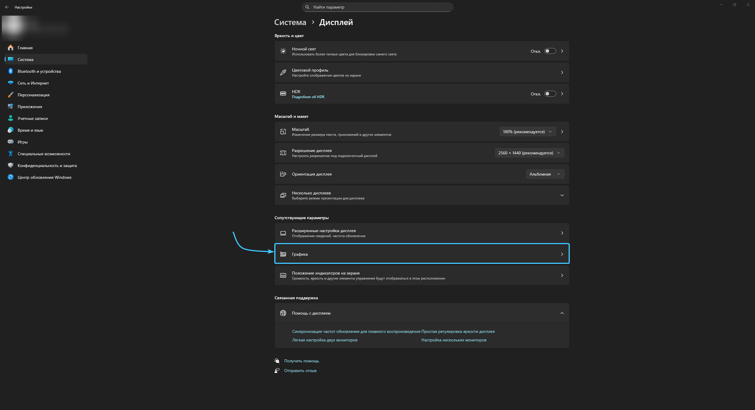 3. Появится список параметров раздела «Дисплей». В самом низу откройте подраздел «Графика».