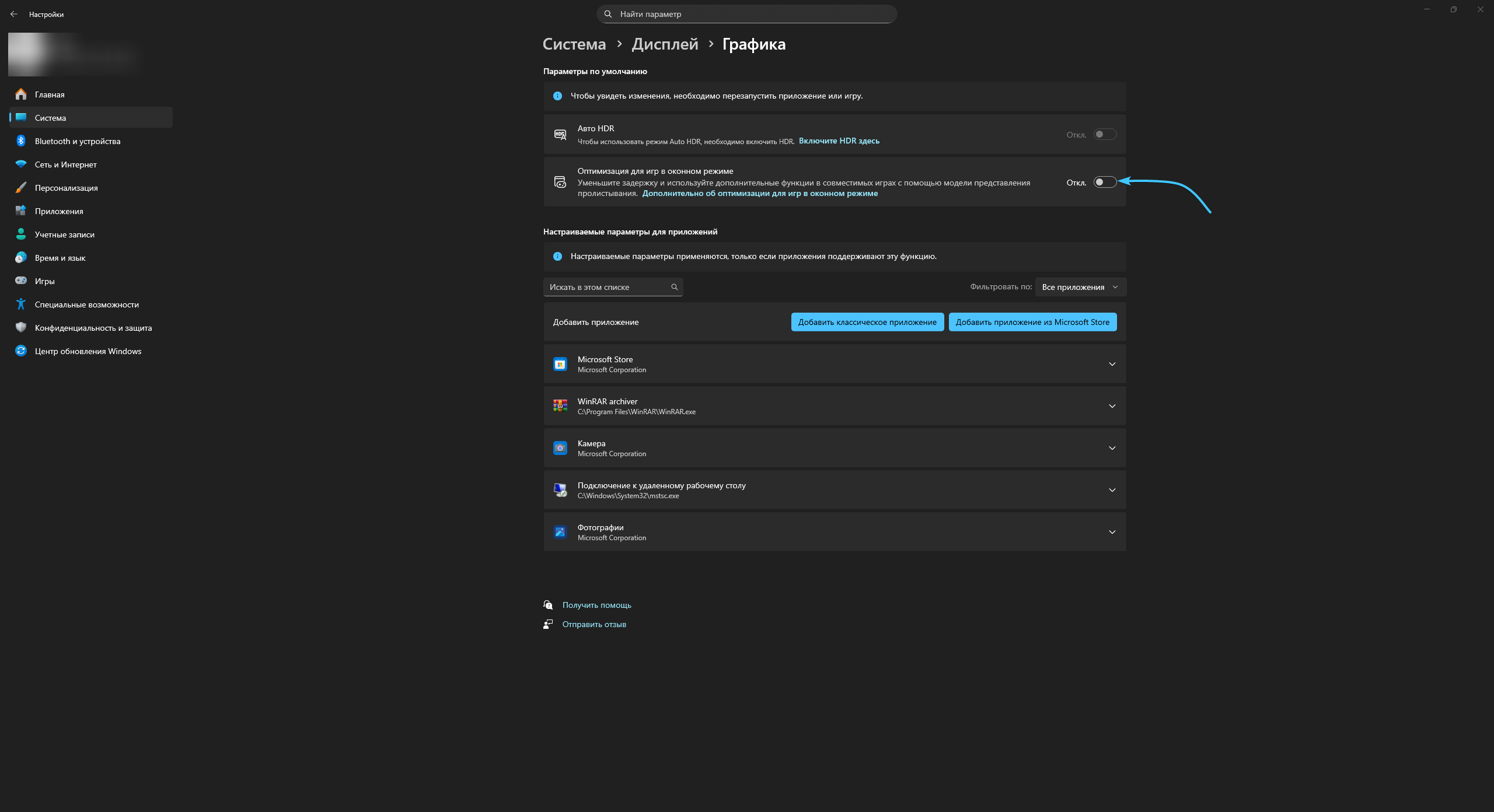 4. Переведите ползунок параметра «Оптимизация для игр в оконном режиме» в положение «Включено».
