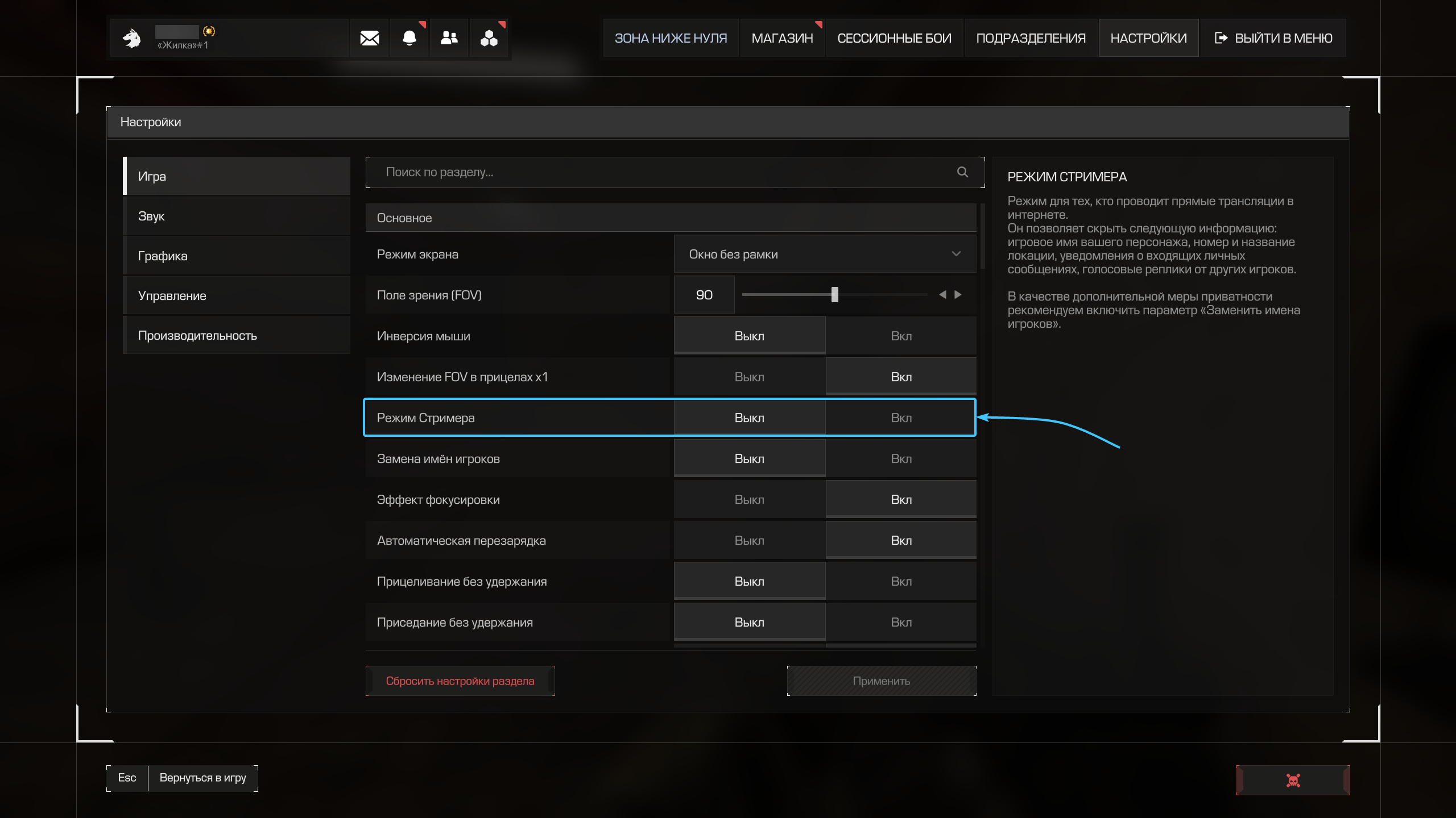 3. Сразу откроется раздел «Игра». В списке включите параметр под названием «Режим Стримера».