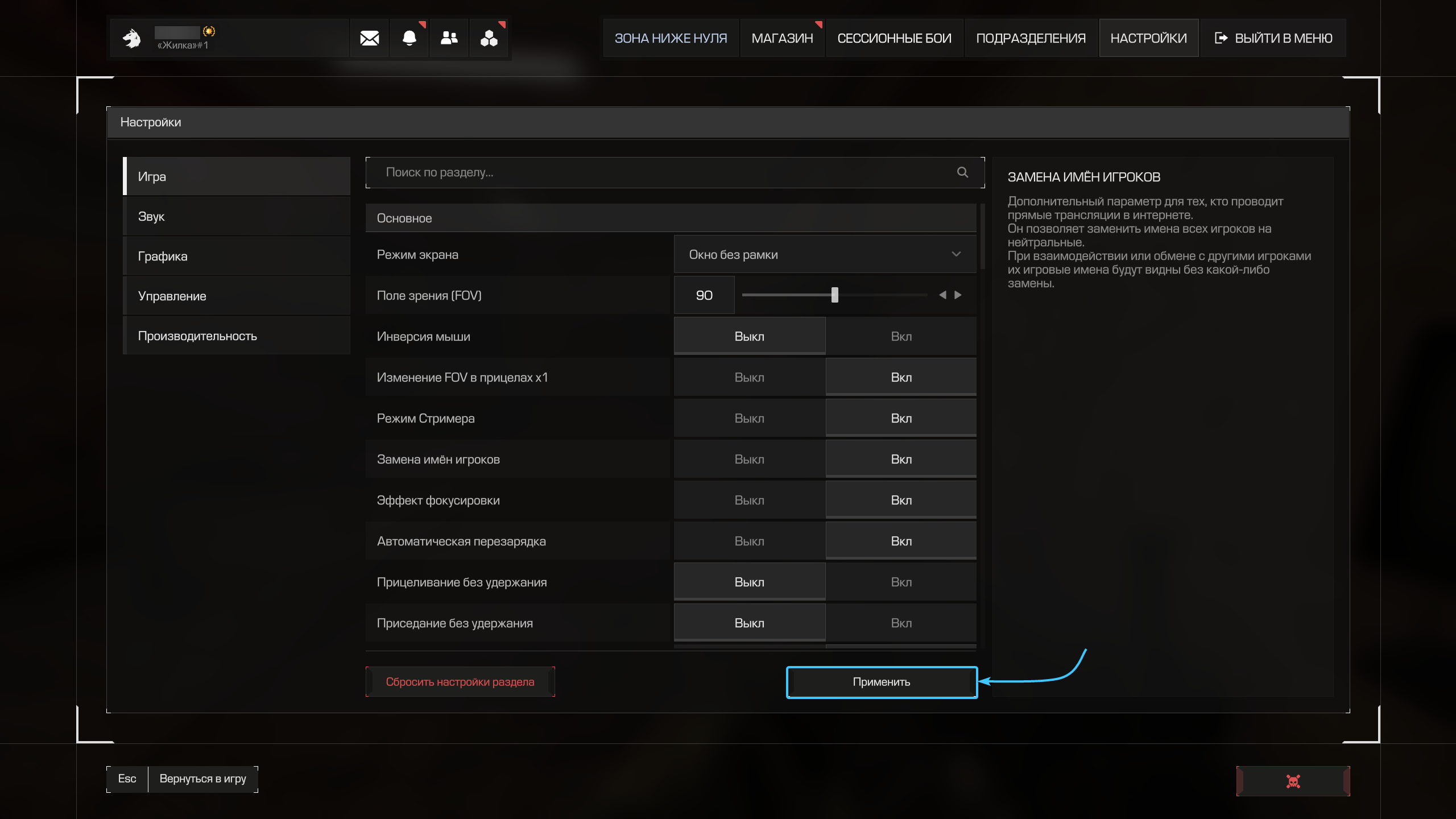 4. После этого включите параметр, который имеет название «Замена имён игроков».