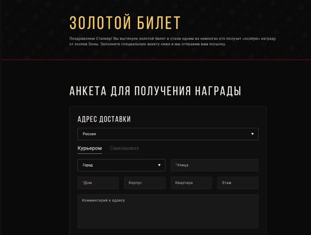 Золотой Билет будет отправлен на внутриигровую почту после завершения технических работ. После передачи билета Виву, анкета для получения награды появится в верхней шапке сайта stalcraft.net. Чтобы получить офлайн-награду, необходимо заполнить эту анкету.