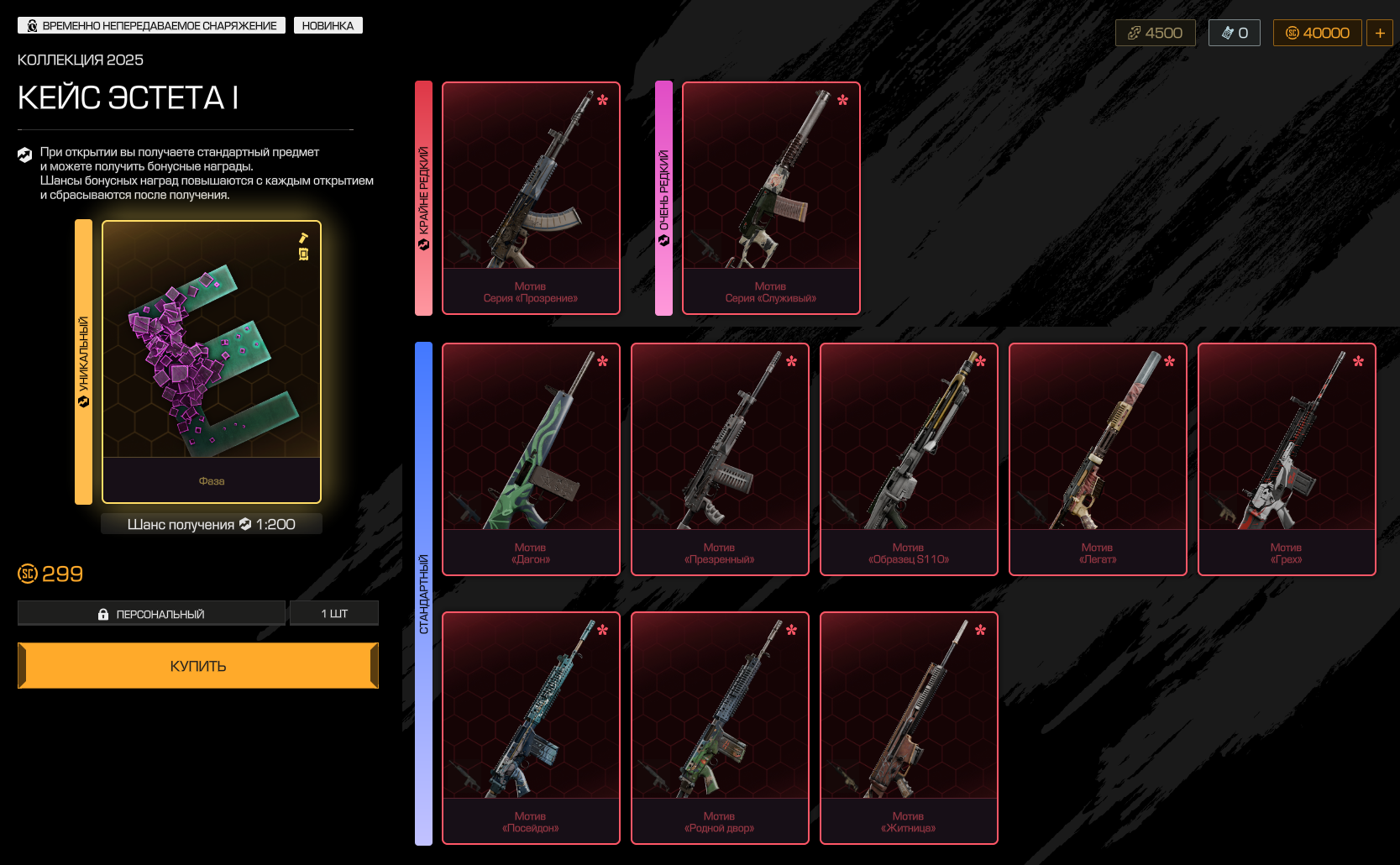 Кейс будет работать по аналогичной механике Особого и нового Передового, с ростом шансов на выпадение уникального предмета. Однако для этого кейса мы добавили механику защиты от повторов: если игрок уже выбил какой-то предмет стандартной редкости, то тот же предмет ему не выпадет, пока он не выбьет все скины той же редкости.