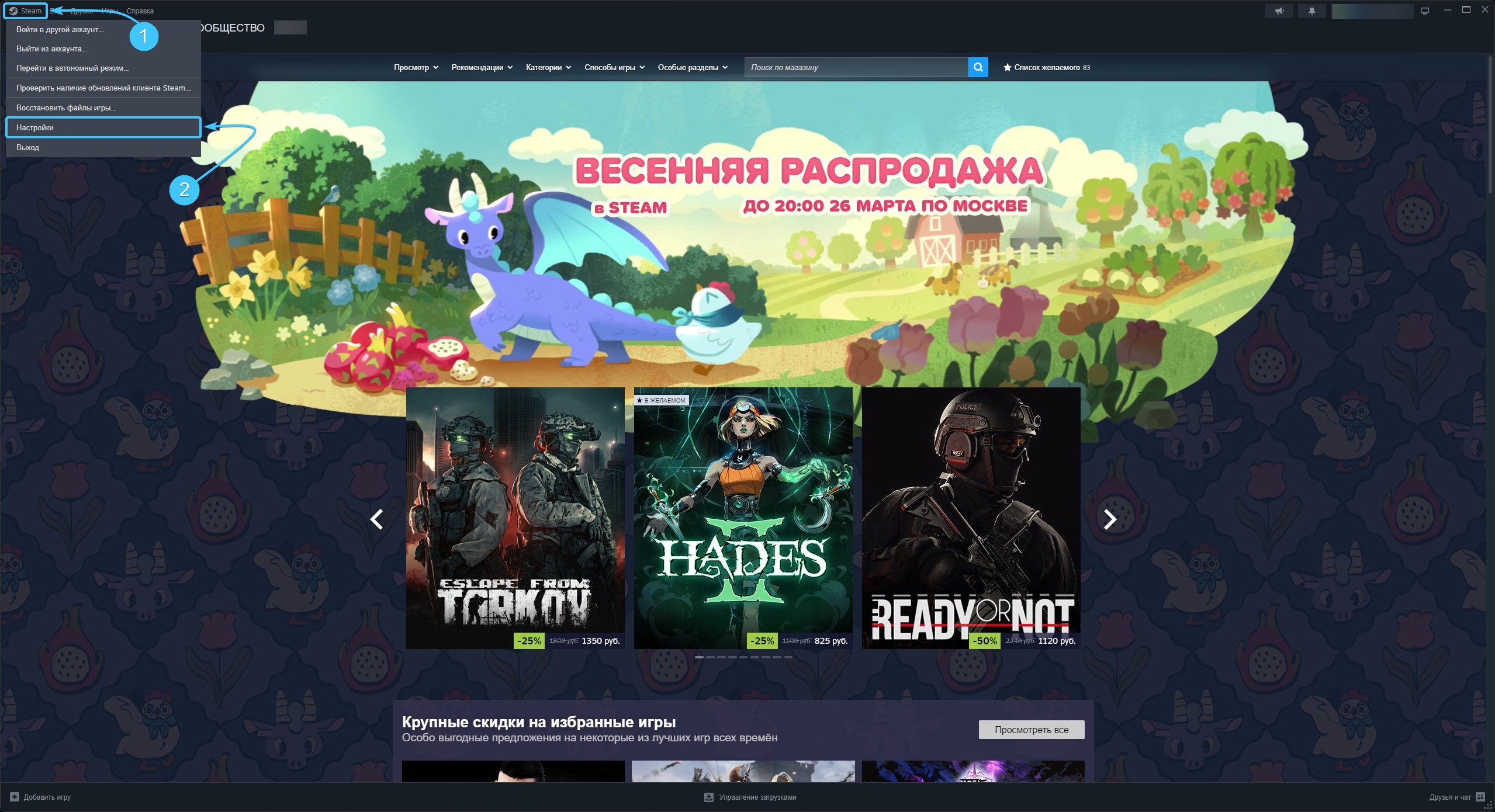 2. В левом верхнем углу нажмите на кнопку «Steam» и откройте раздел под названием «Настройки».
