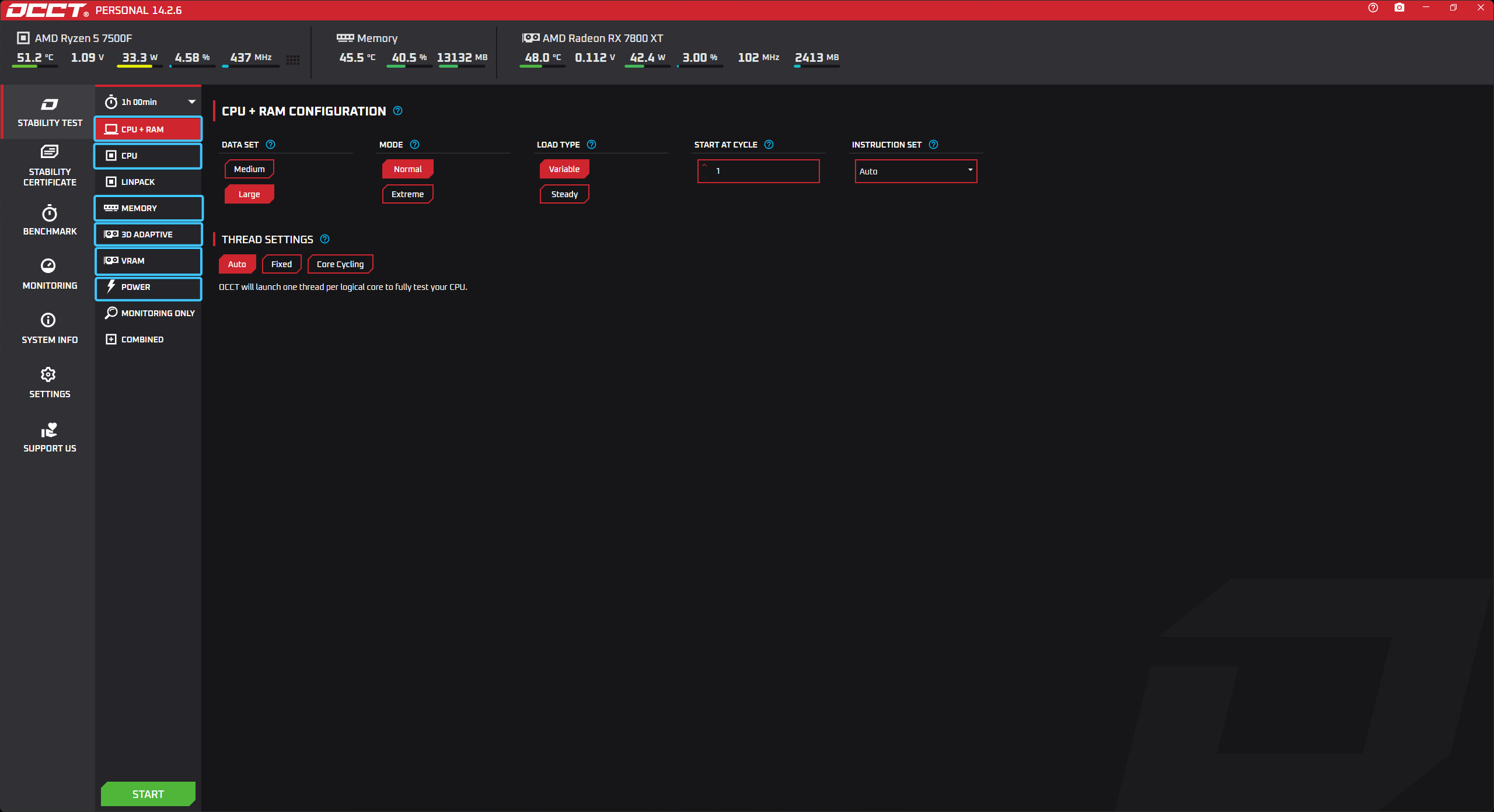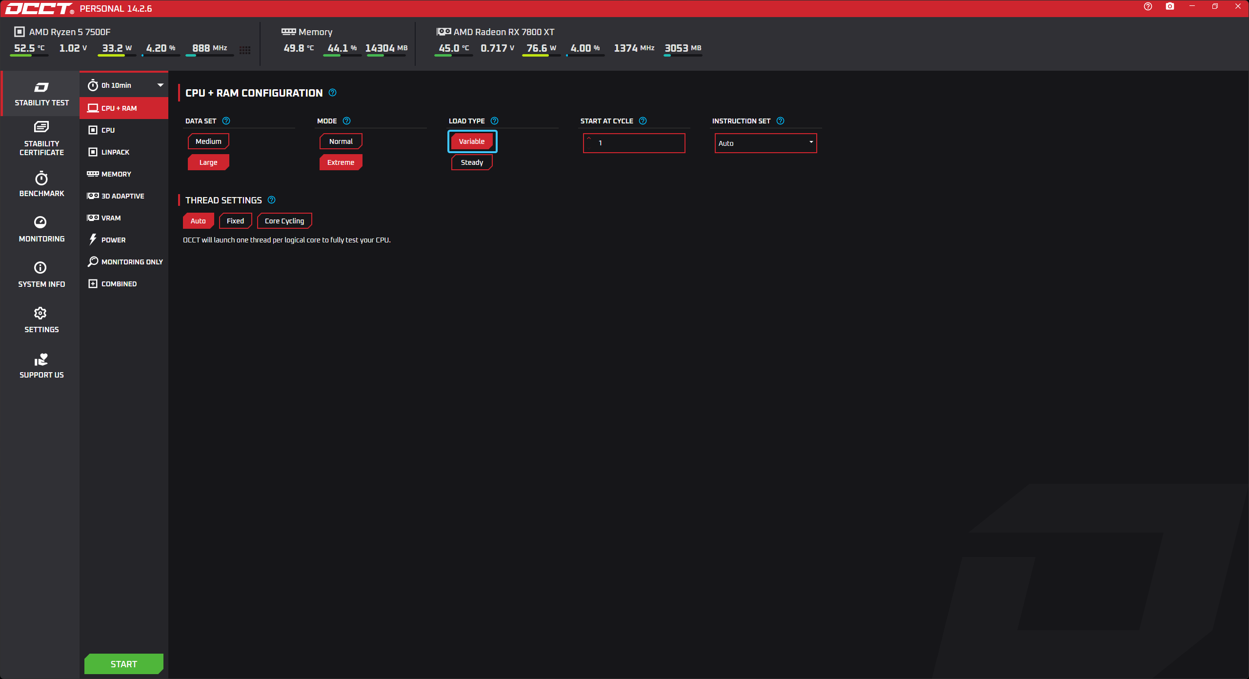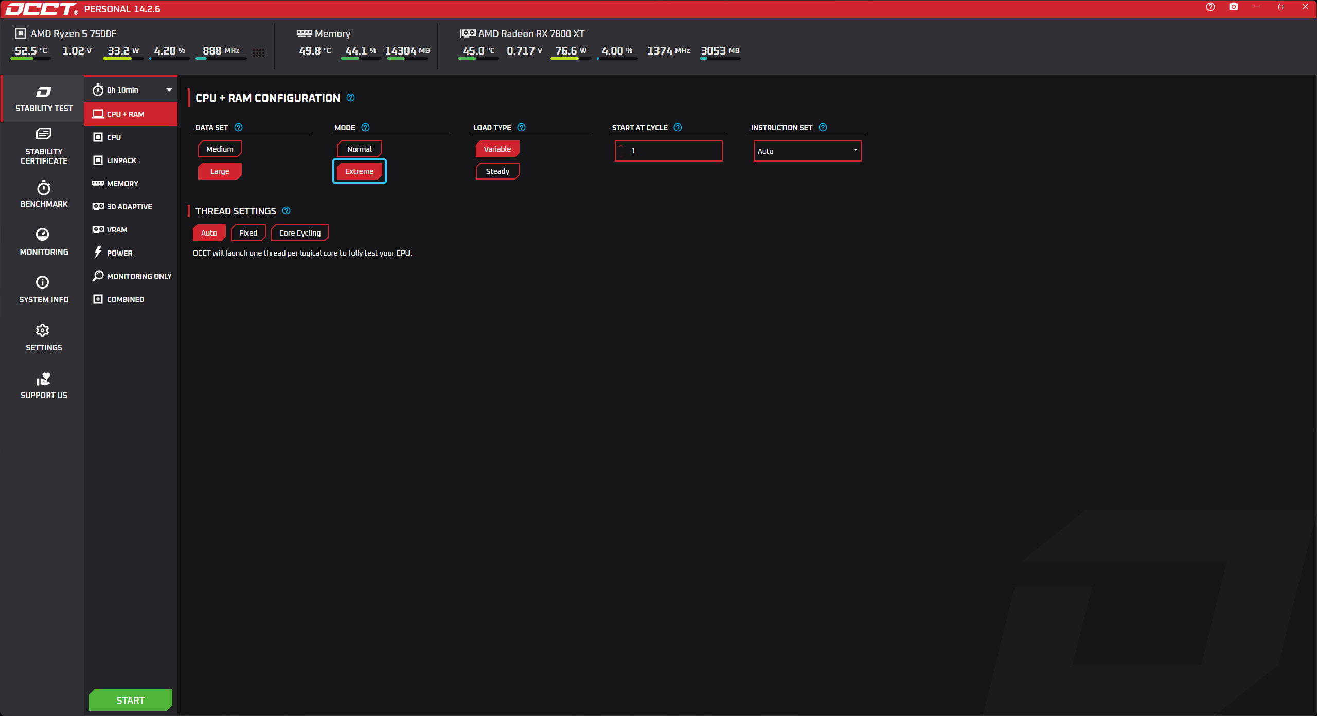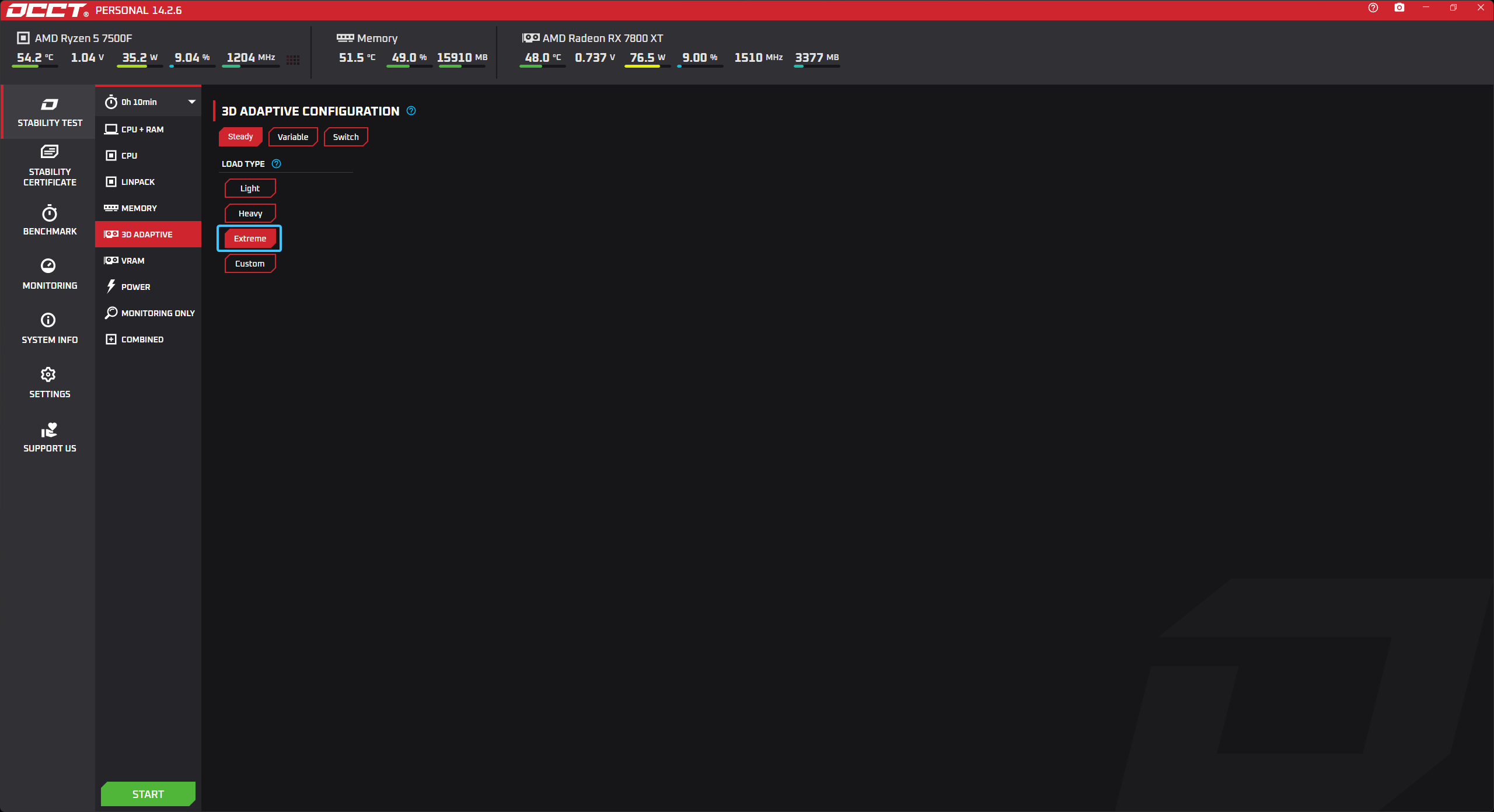 В параметре под названием «LOAD TYPE» выберите вариант «EXTREME» для тщательного теста.