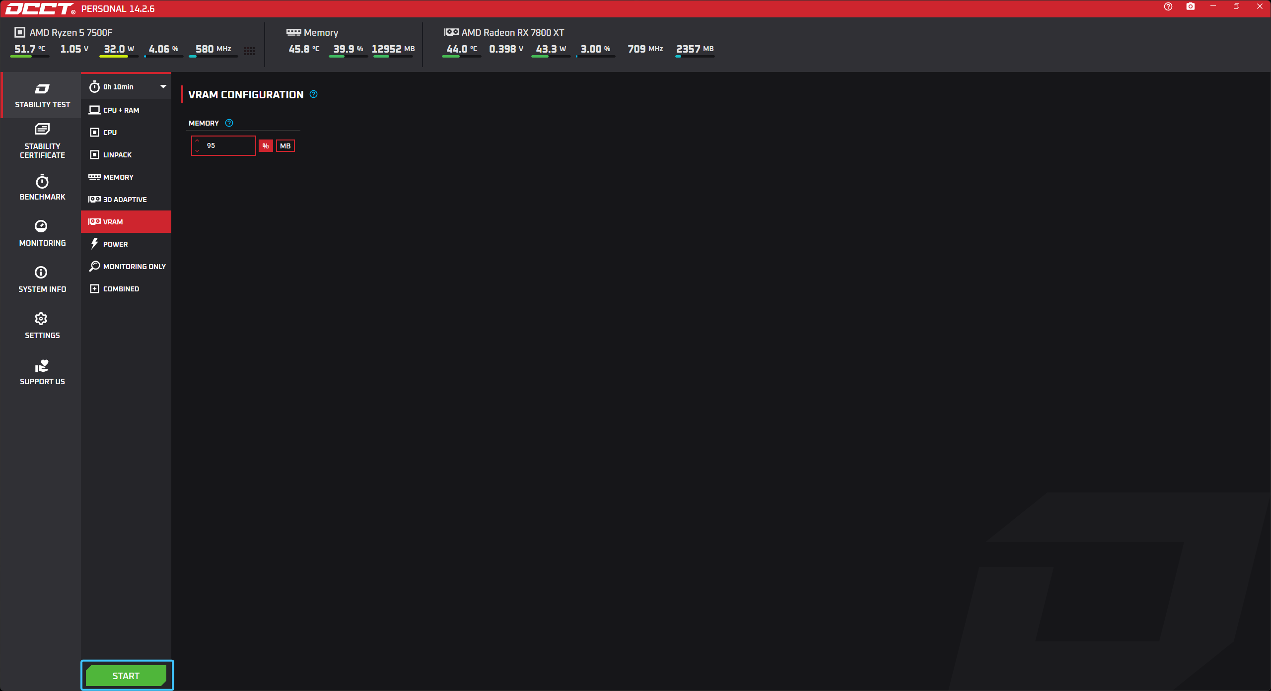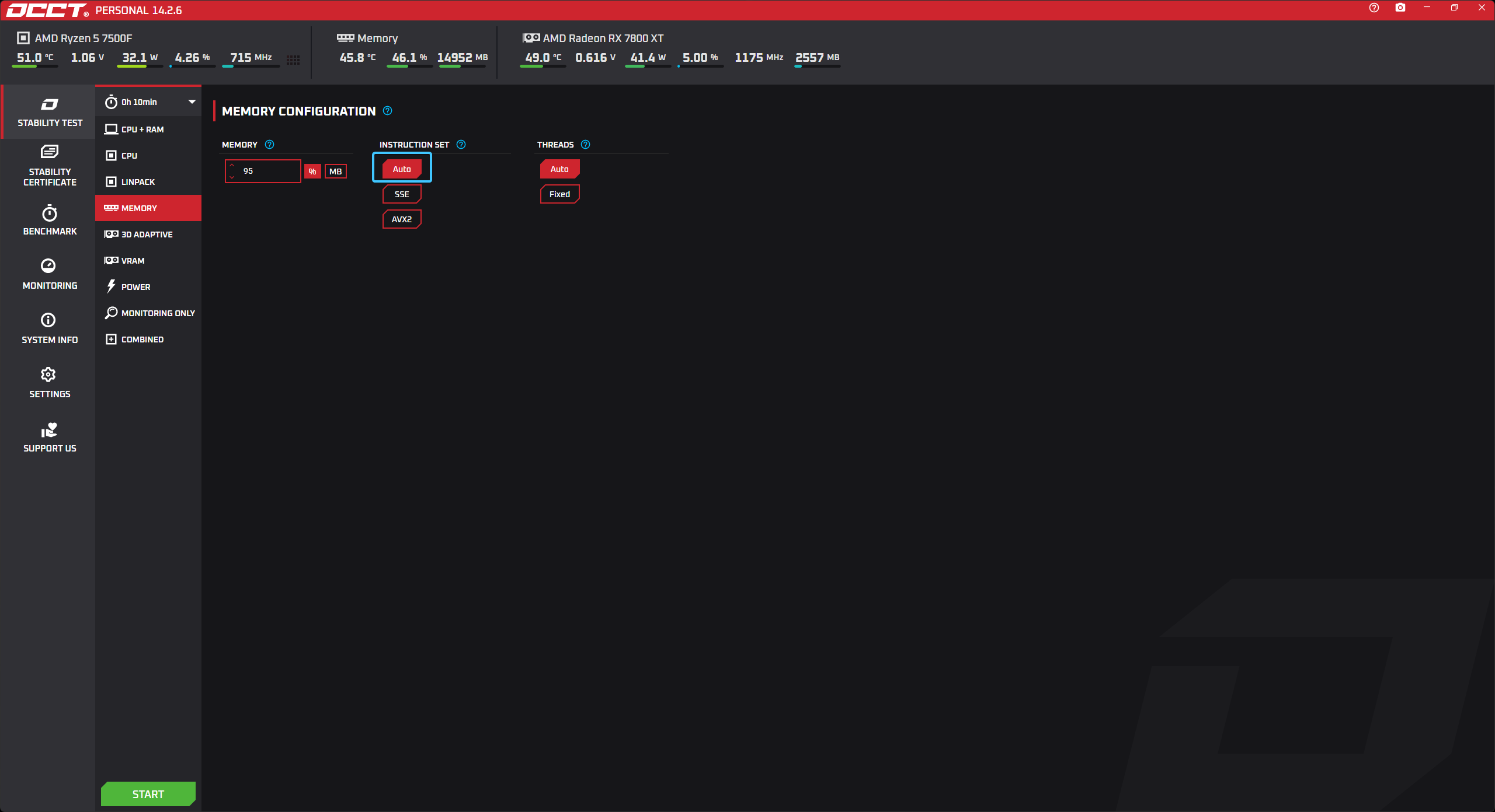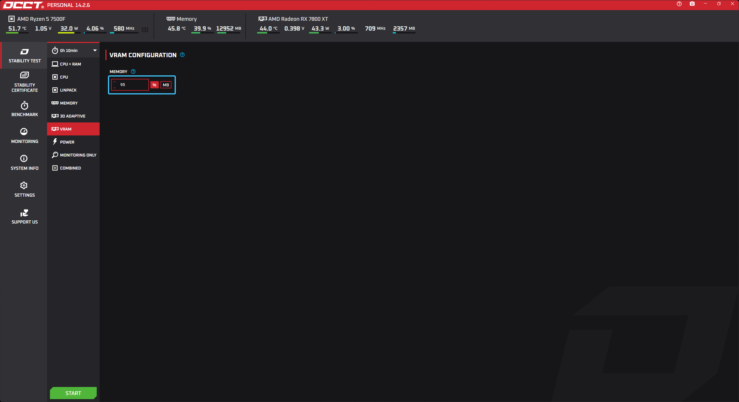 В параметре под названием «MEMORY» выставите значение «95%» для большей нагрузки на память.