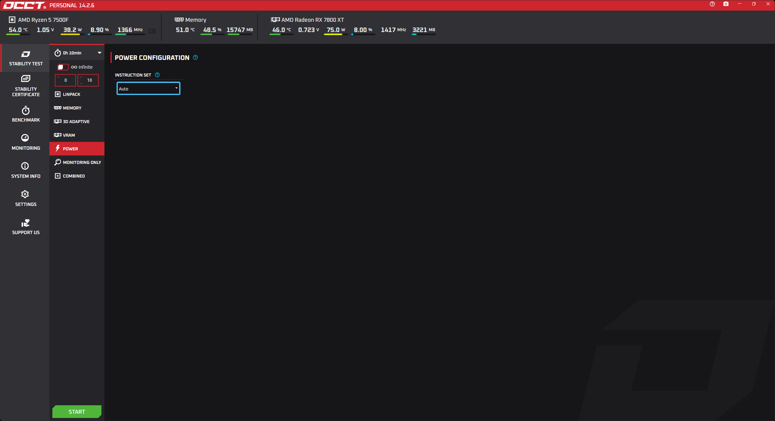 В параметре под названием «INSTRUCTION SET» выберите вариант «Auto» для общего тестирования.
