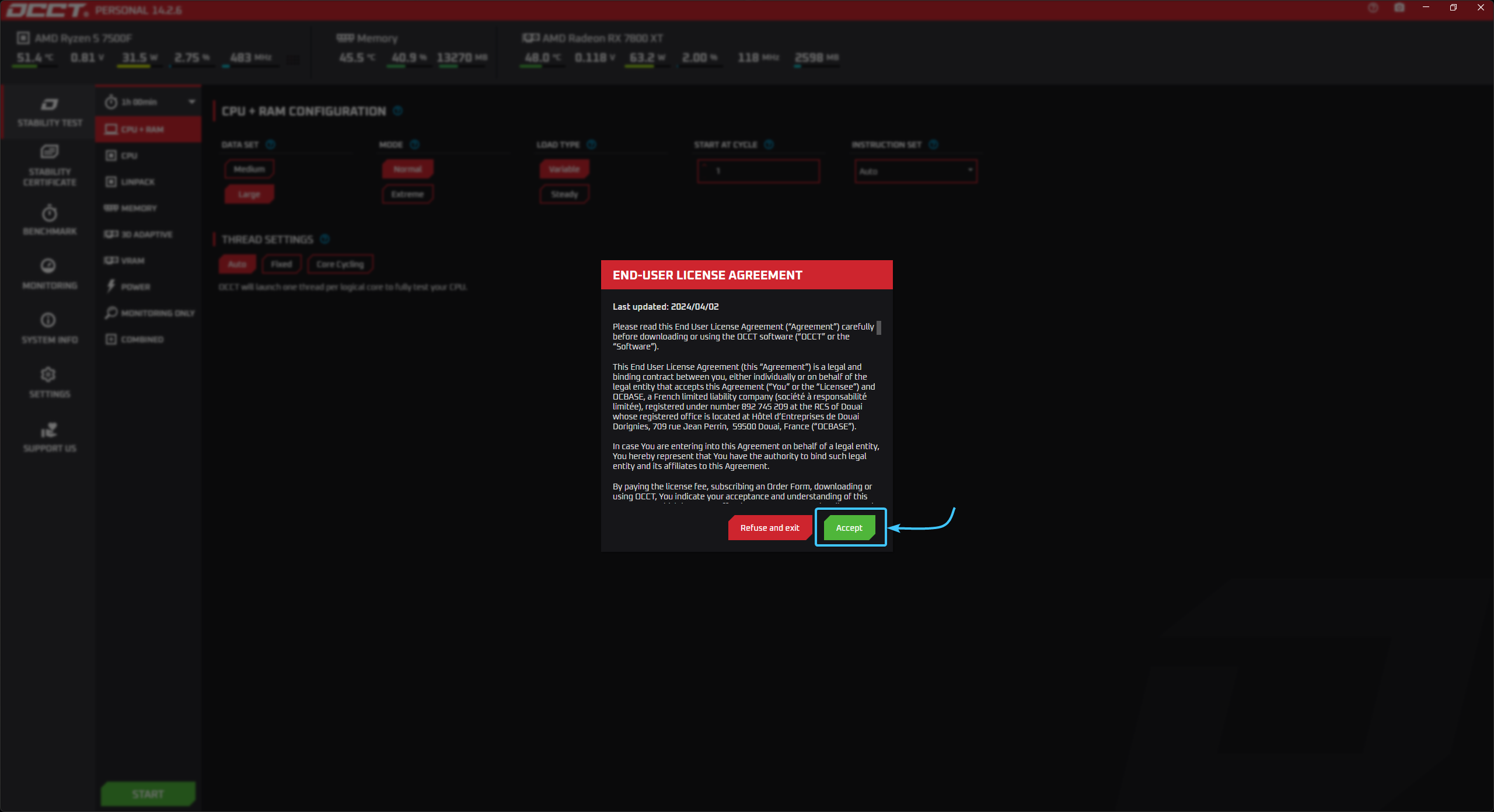 3. Запустите скачанный установщик и установите приложение «OCCT» на ваше текущее устройство.