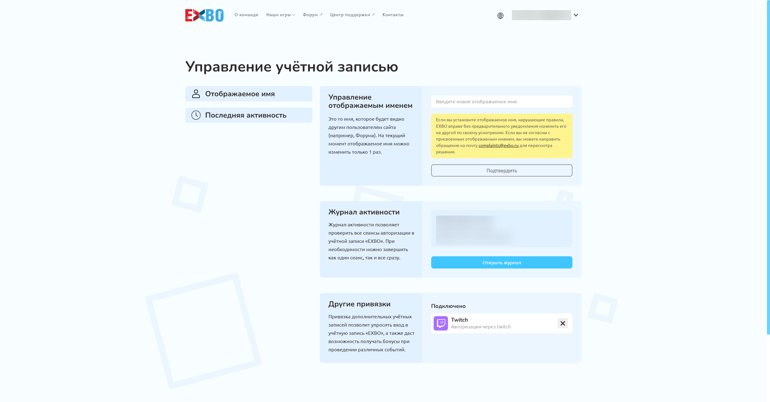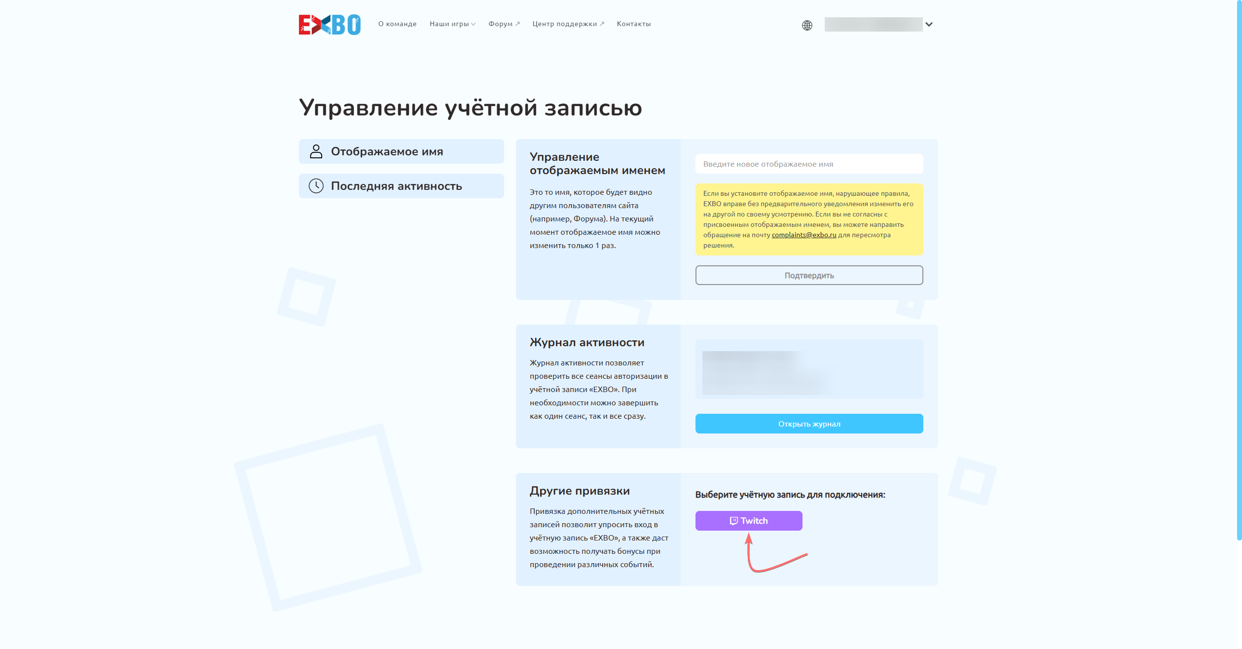 6. После этого учётная запись сервиса «Twitch» будет успешно привязана к учётной записи «EXBO».