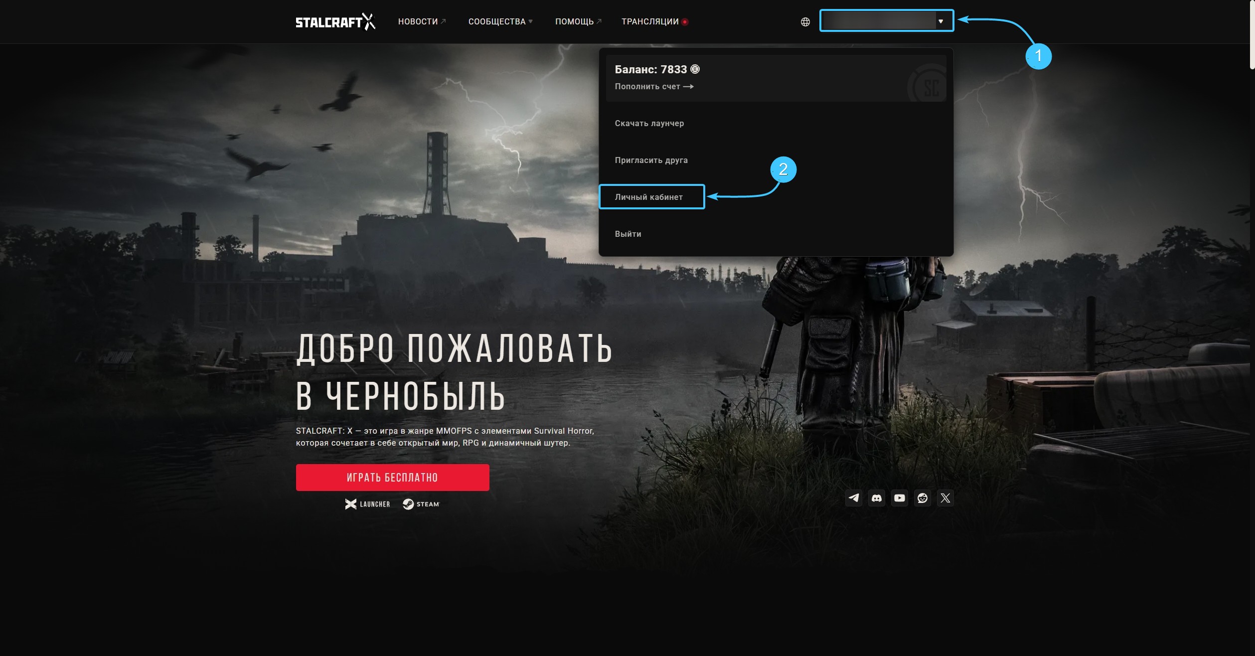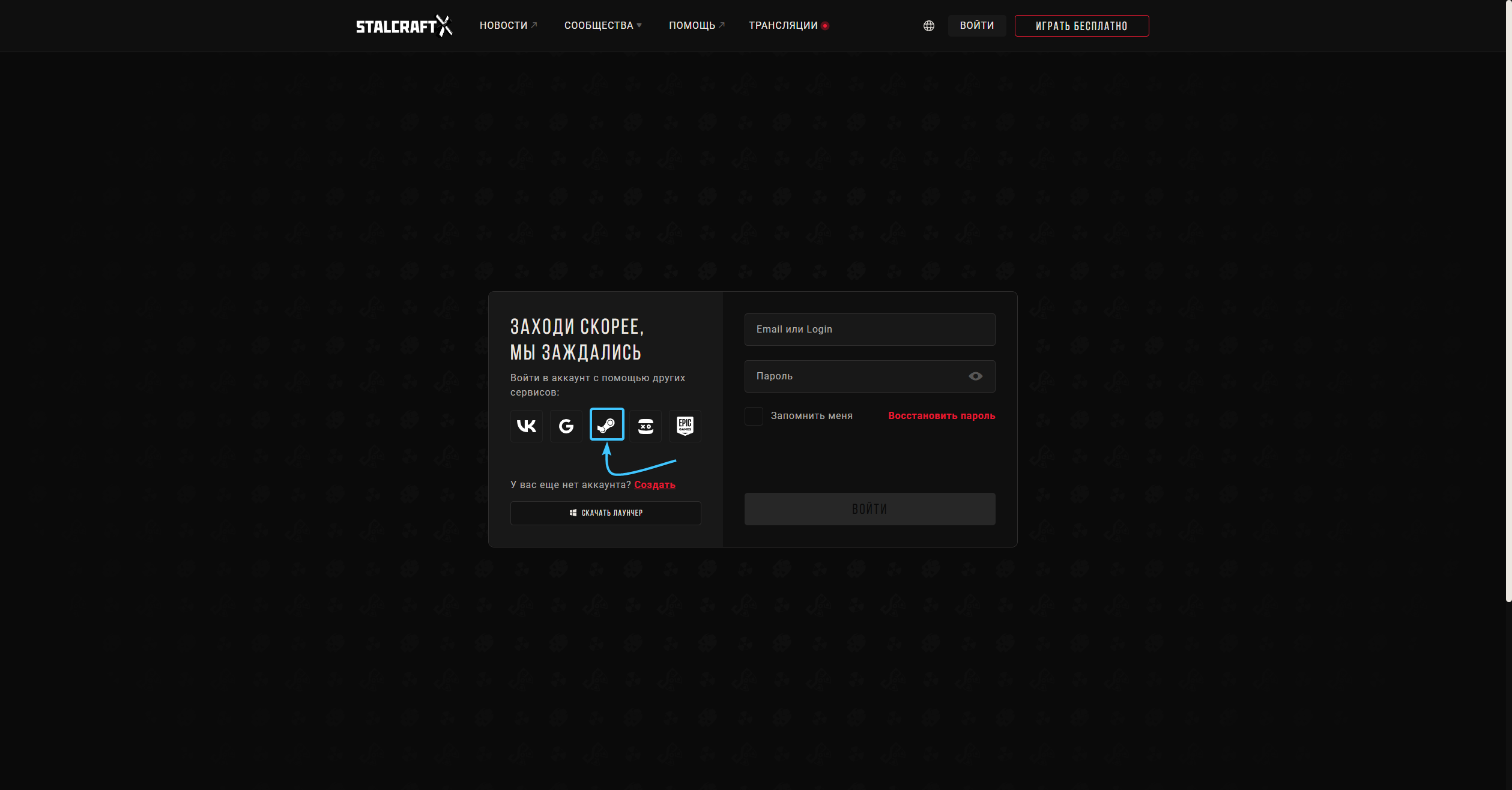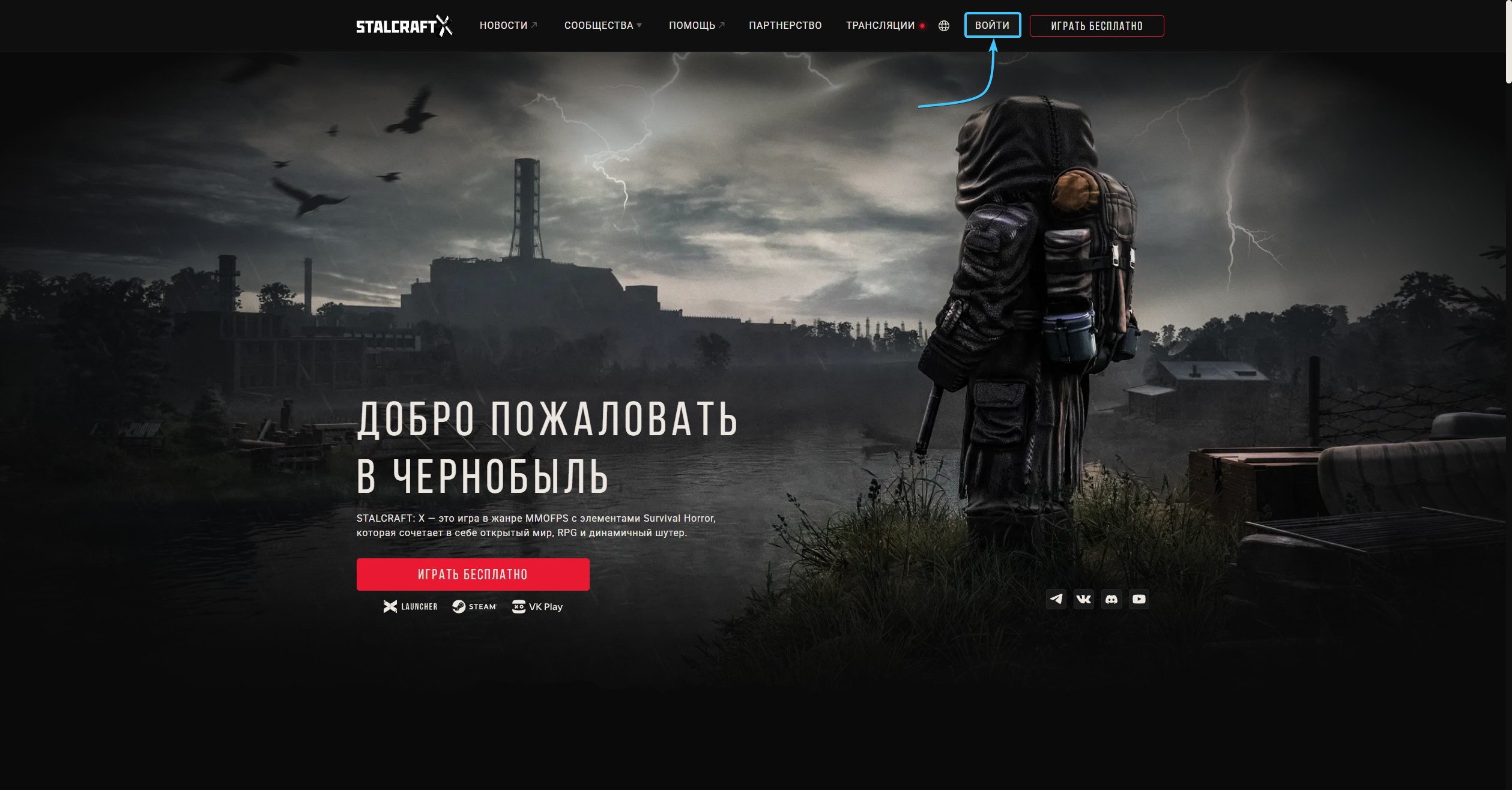 1. Перейдите на официальный сайт игры «STALCRAFT: X» и в правом верхнем углу нажмите «Войти».