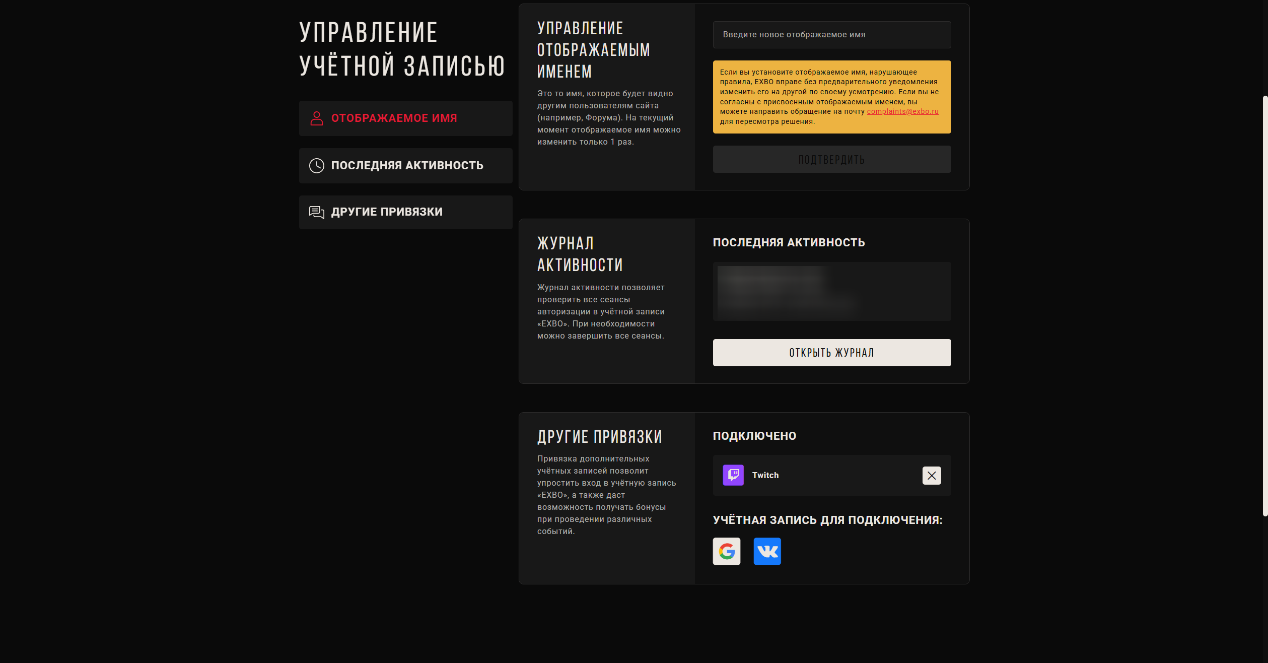 Внимание! Не привязывайте учётную запись «EXBO» к другой учётной записи «Twitch» в процессе получения наград. Используйте только одну привязку к учётной записи «Twitch». В противном случае, получение всех наград «Twitch Drops» будет невозможно даже после обращения в службу поддержки.