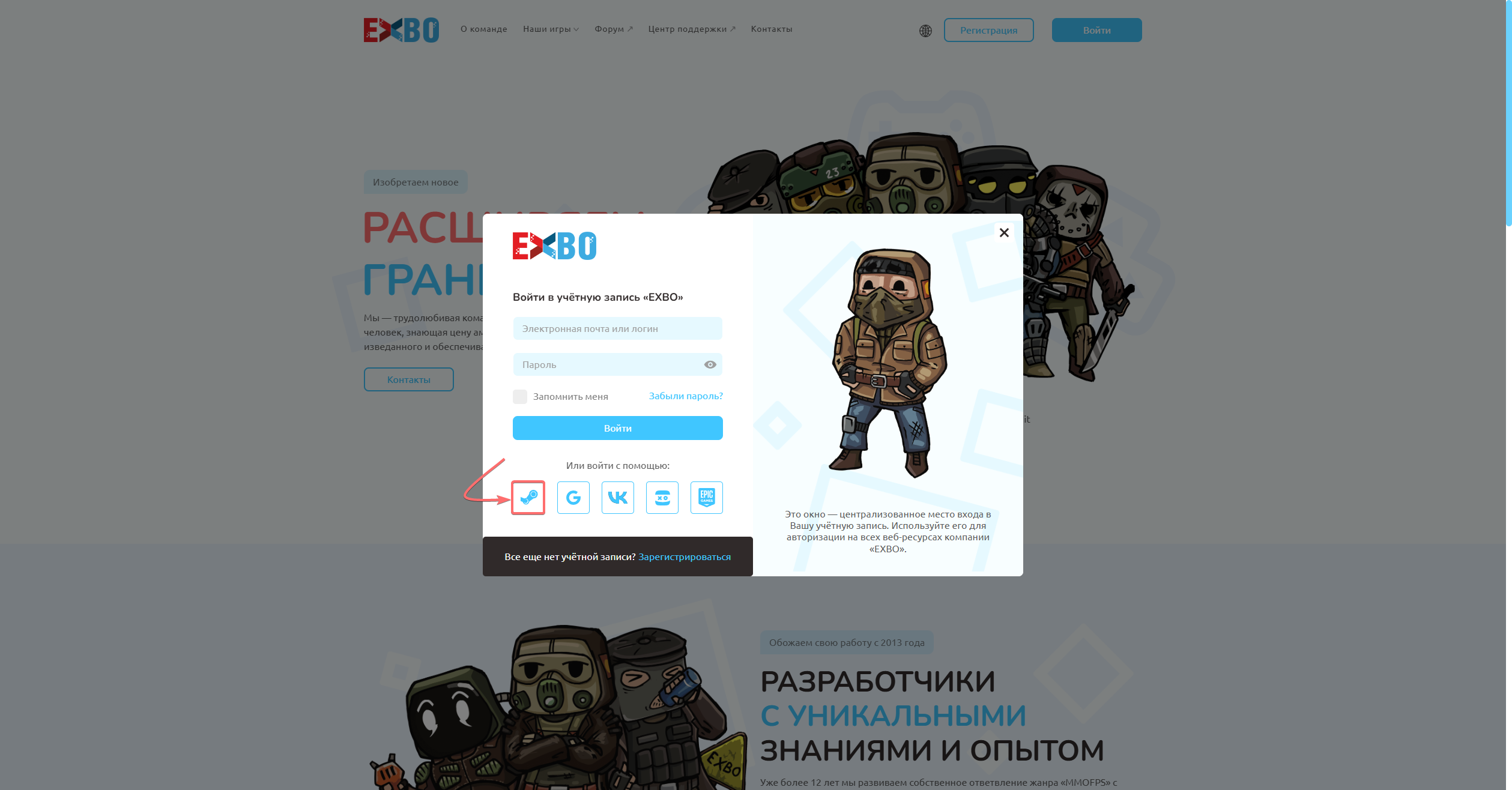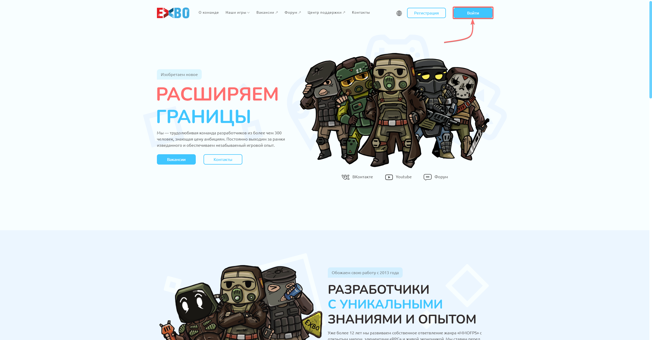 1. Перейдите на официальный сайт компании «EXBO» и в правом верхнем углу нажмите кнопку «Войти».