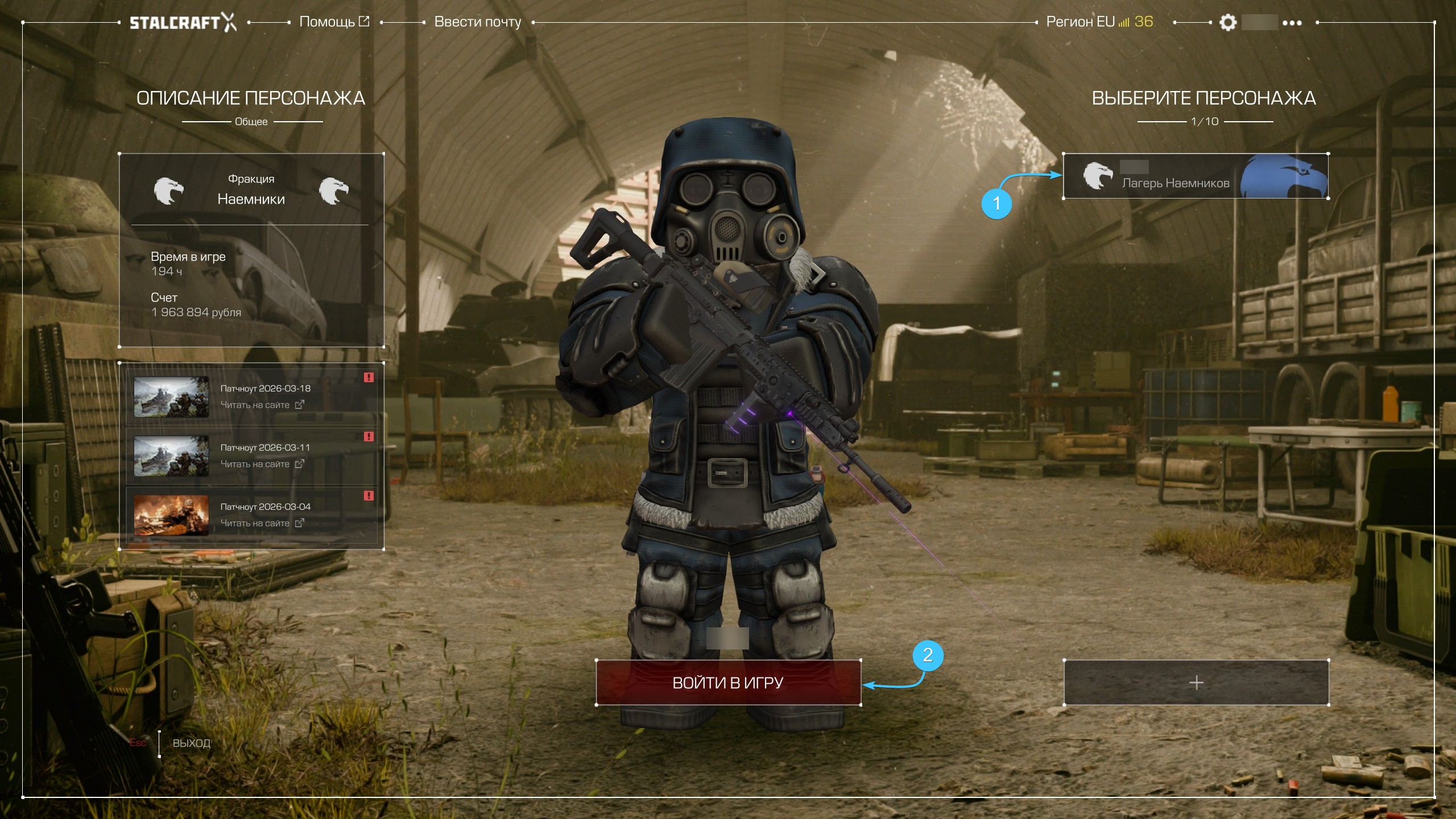 3. Запустите «STALCRAFT: X». В главном меню выберите необходимого персонажа и зайдите на сервер.