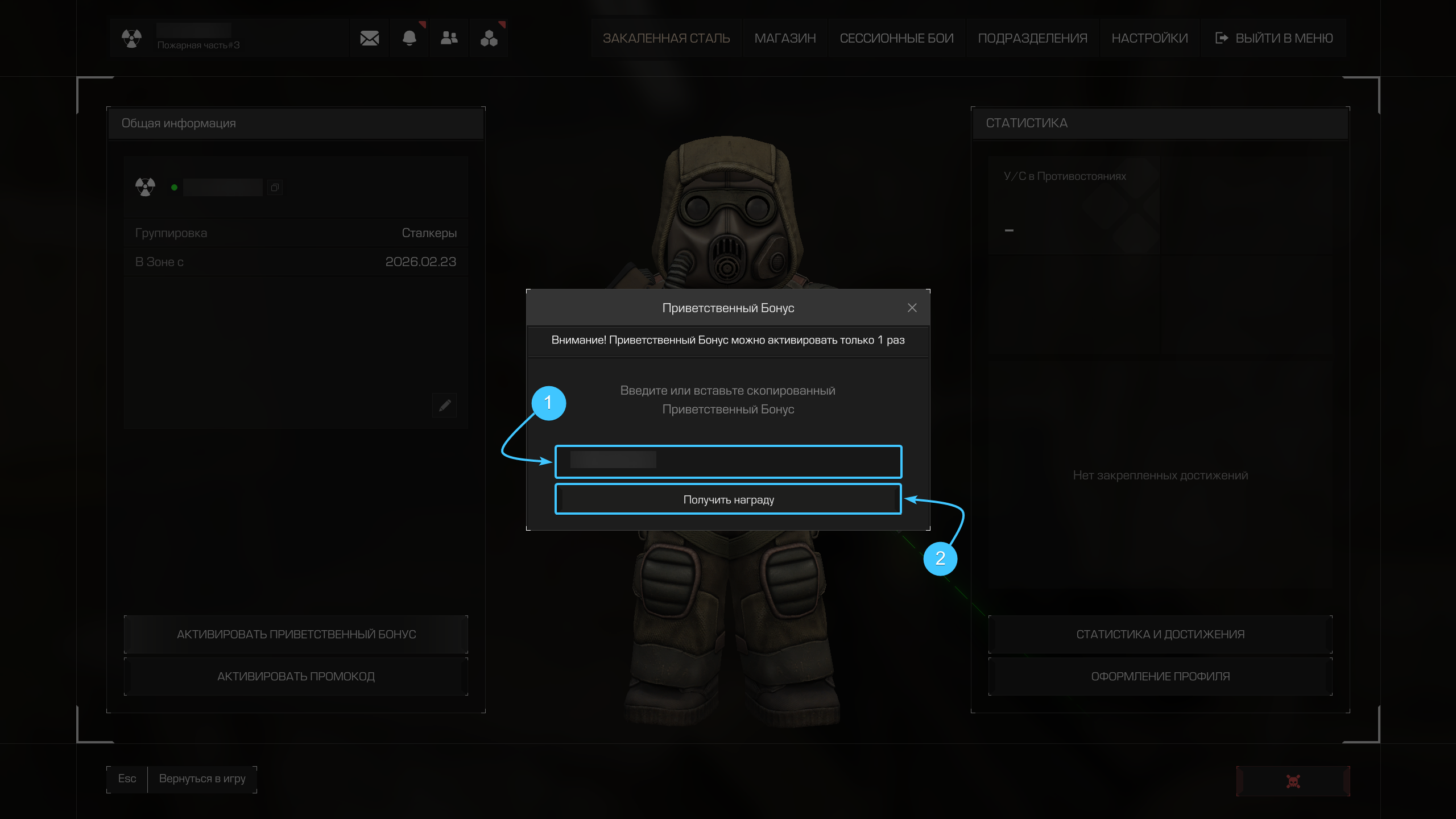 4. Введите приветственный код (1) и нажмите кнопку «Получить награду» (2) для его активации.
