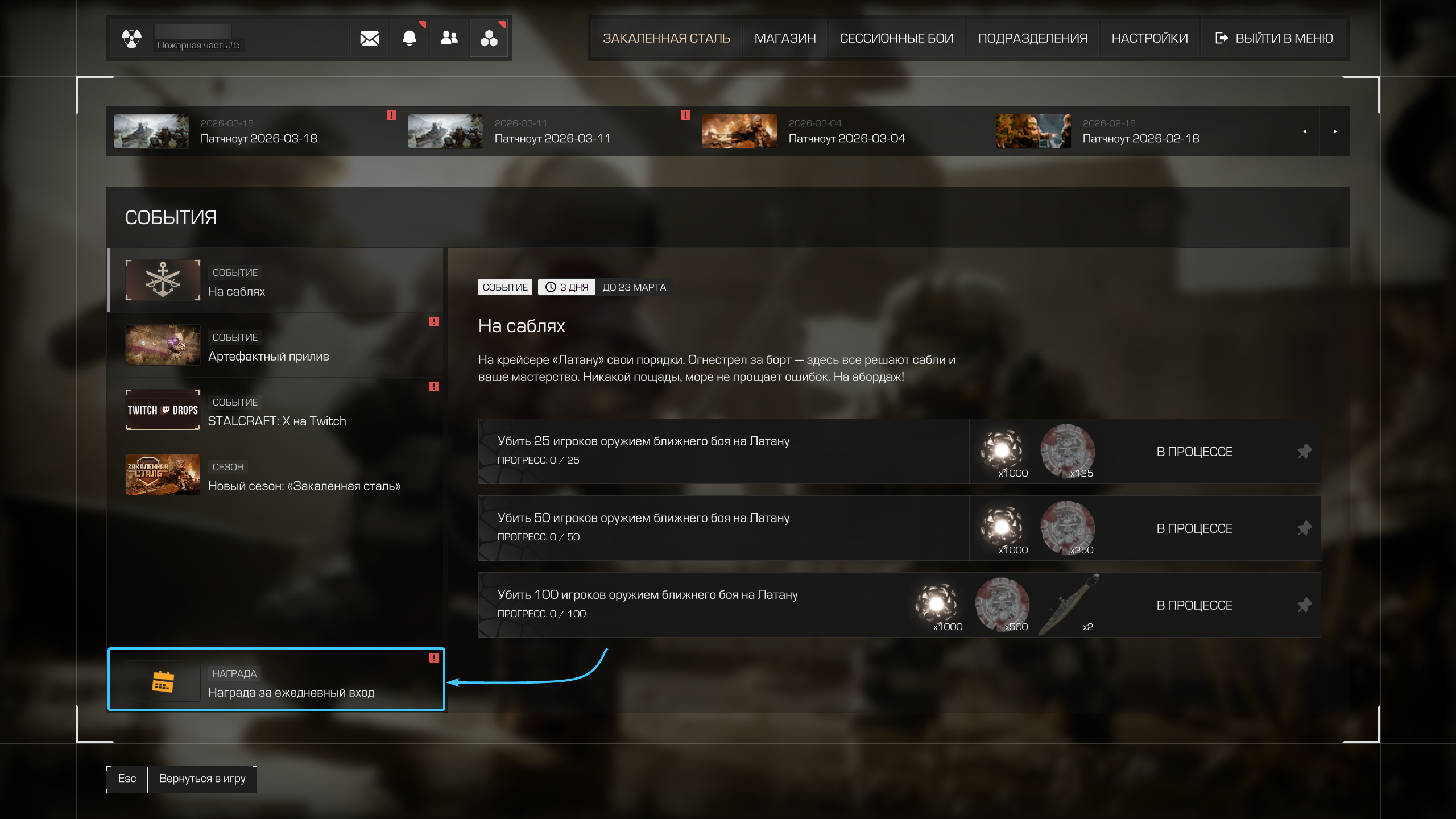 3. Откроется меню событий. В левом нижнем углу нажмите кнопку «Награда за ежедневный вход».