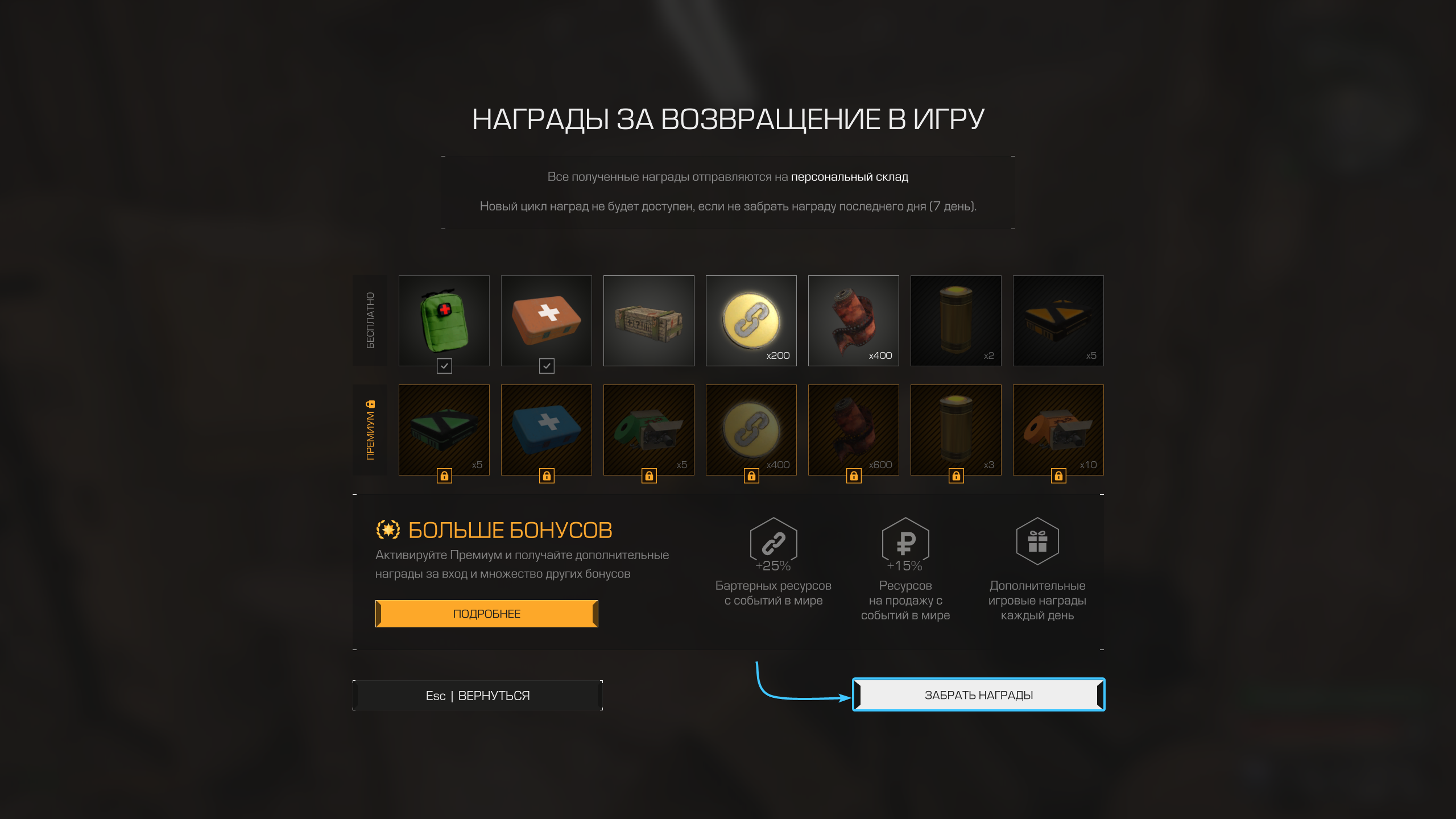4. Появится список ежедневных наград текущей недели. Нажмите кнопку «Забрать награды».