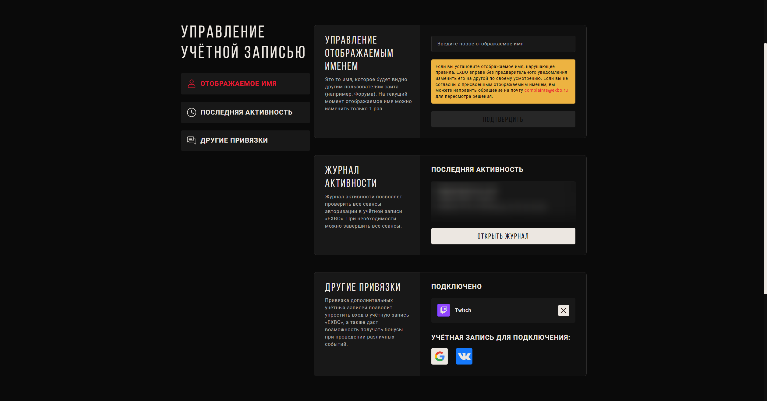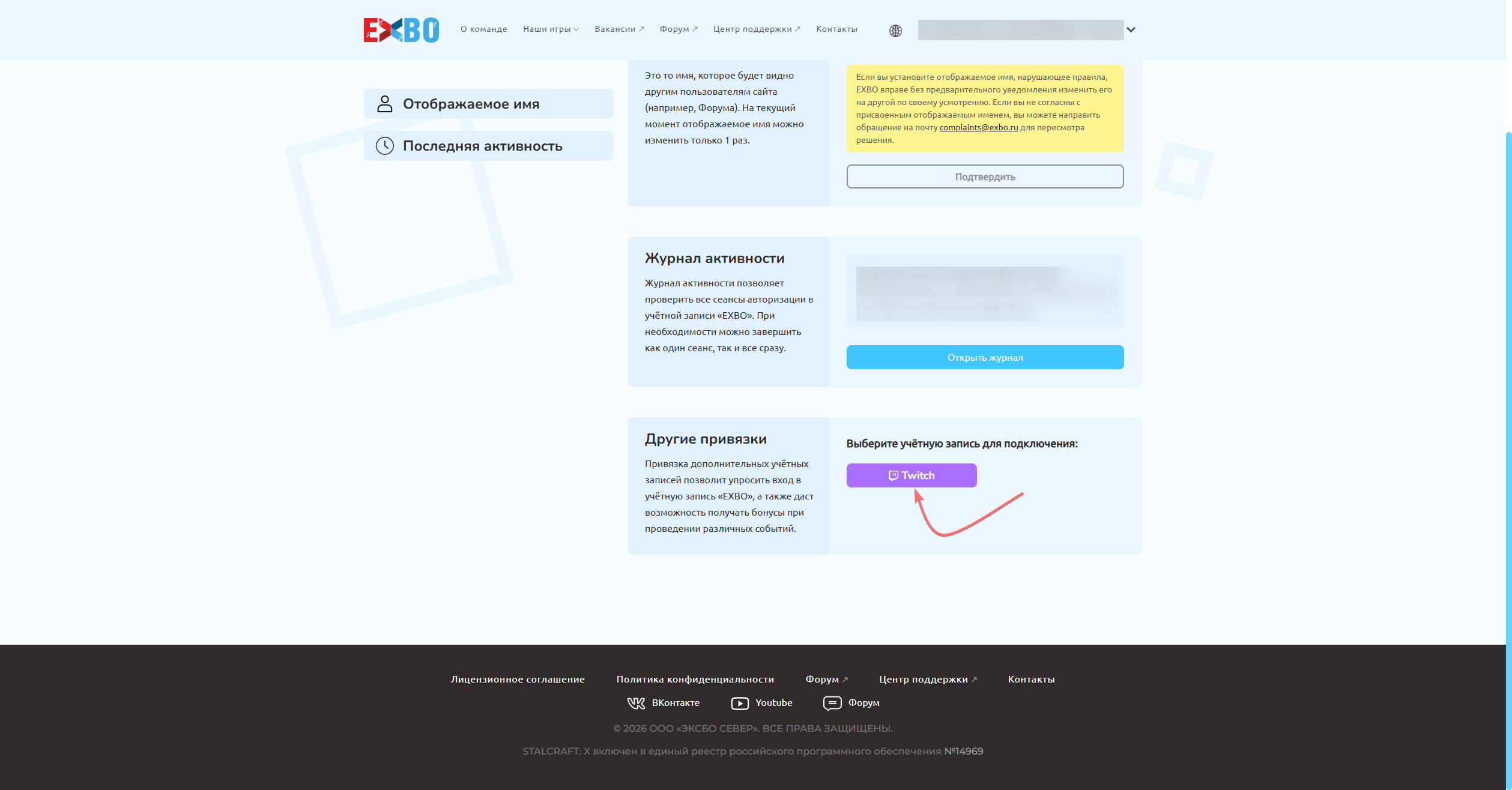 Внимание! Не привязывайте учётную запись «EXBO» к другой учётной записи «Twitch» в процессе получения наград. Используйте только одну привязку к учётной записи «Twitch». В противном случае, получение всех наград «Twitch Drops» будет невозможно даже после обращения в службу поддержки.