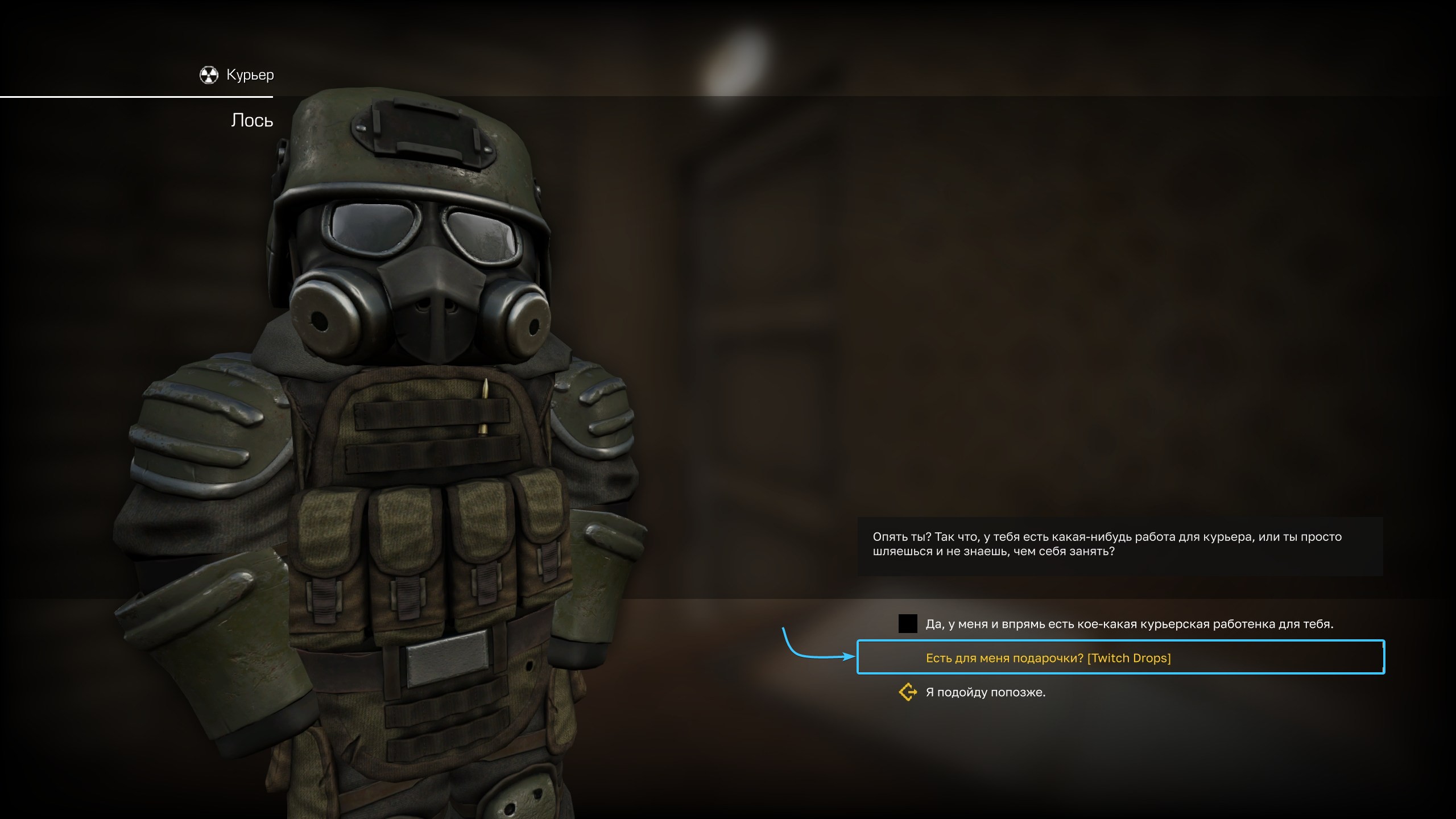 5. Начните взаимодействие с ним. В диалоге выберите вариант «Есть для меня подарки? [Twitch Drops]».