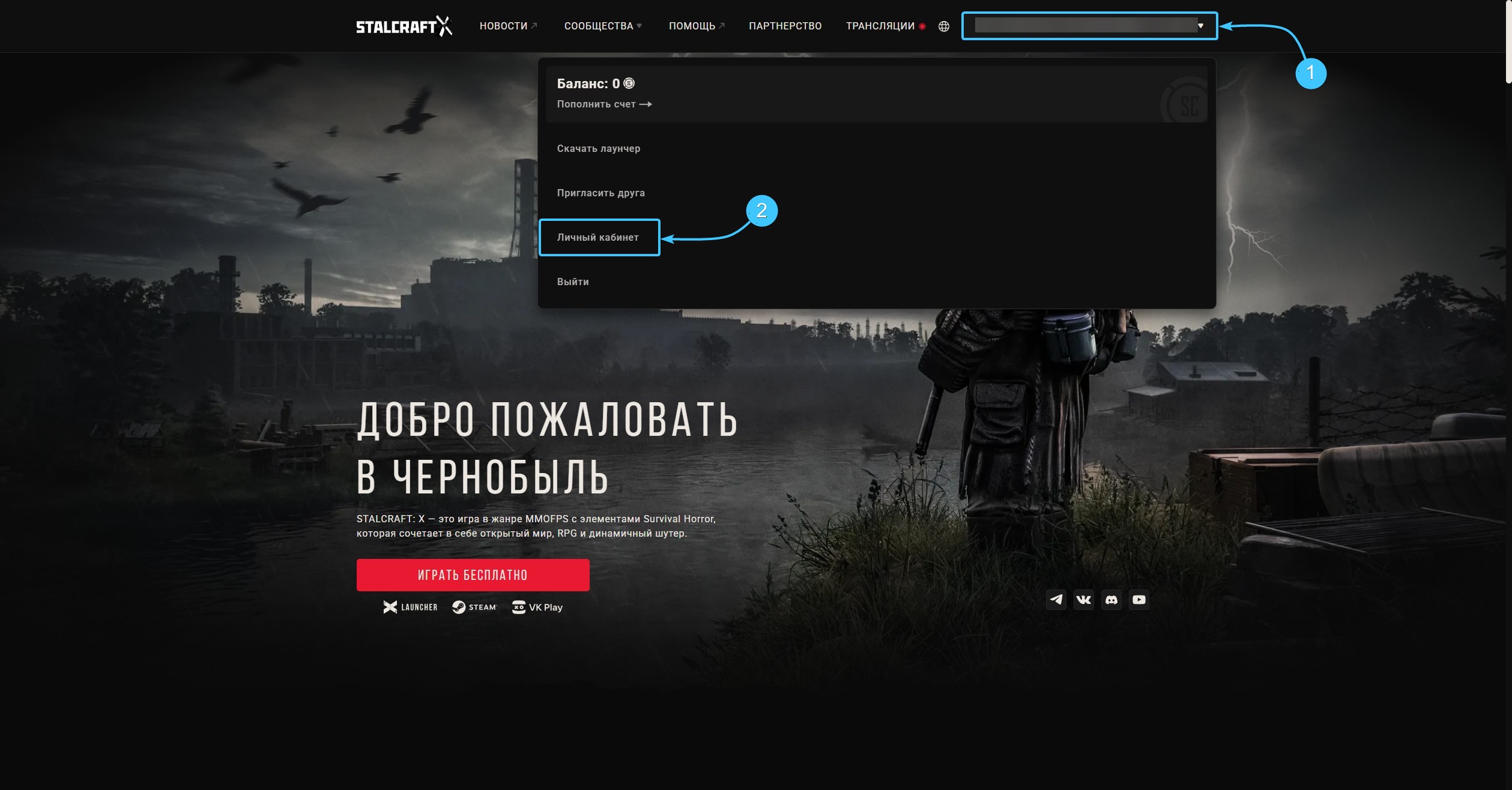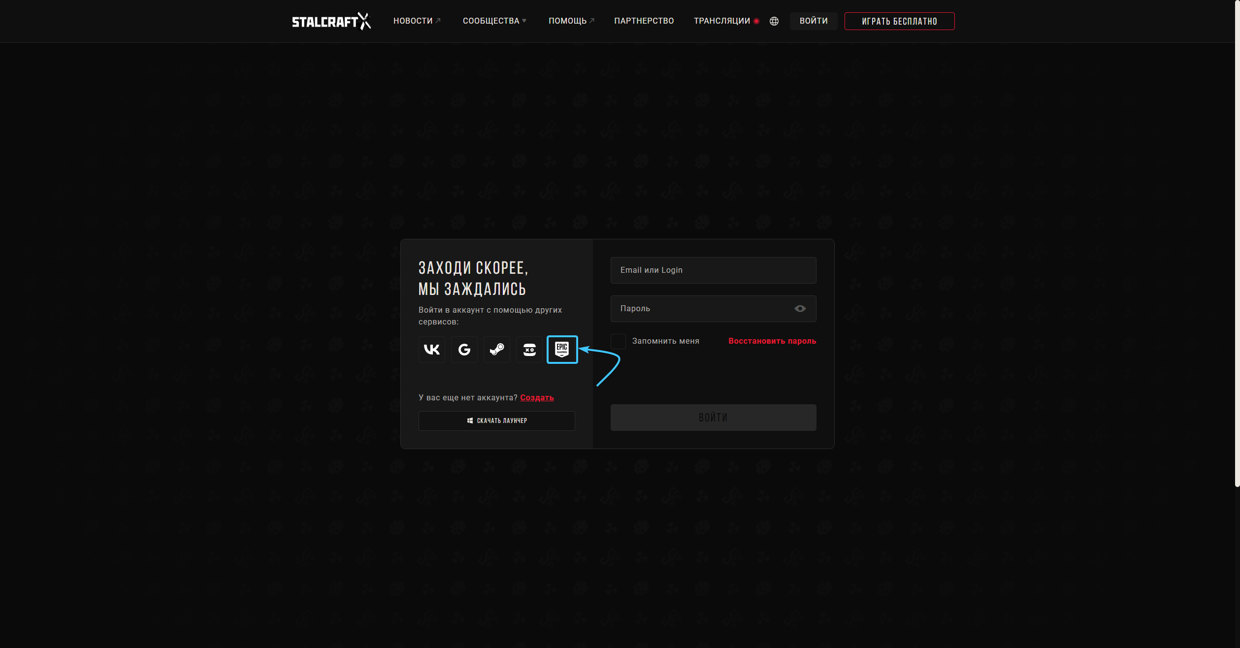1. Перейдите на официальный сайт игры «STALCRAFT: X» и в правом верхнем углу нажмите «Войти».