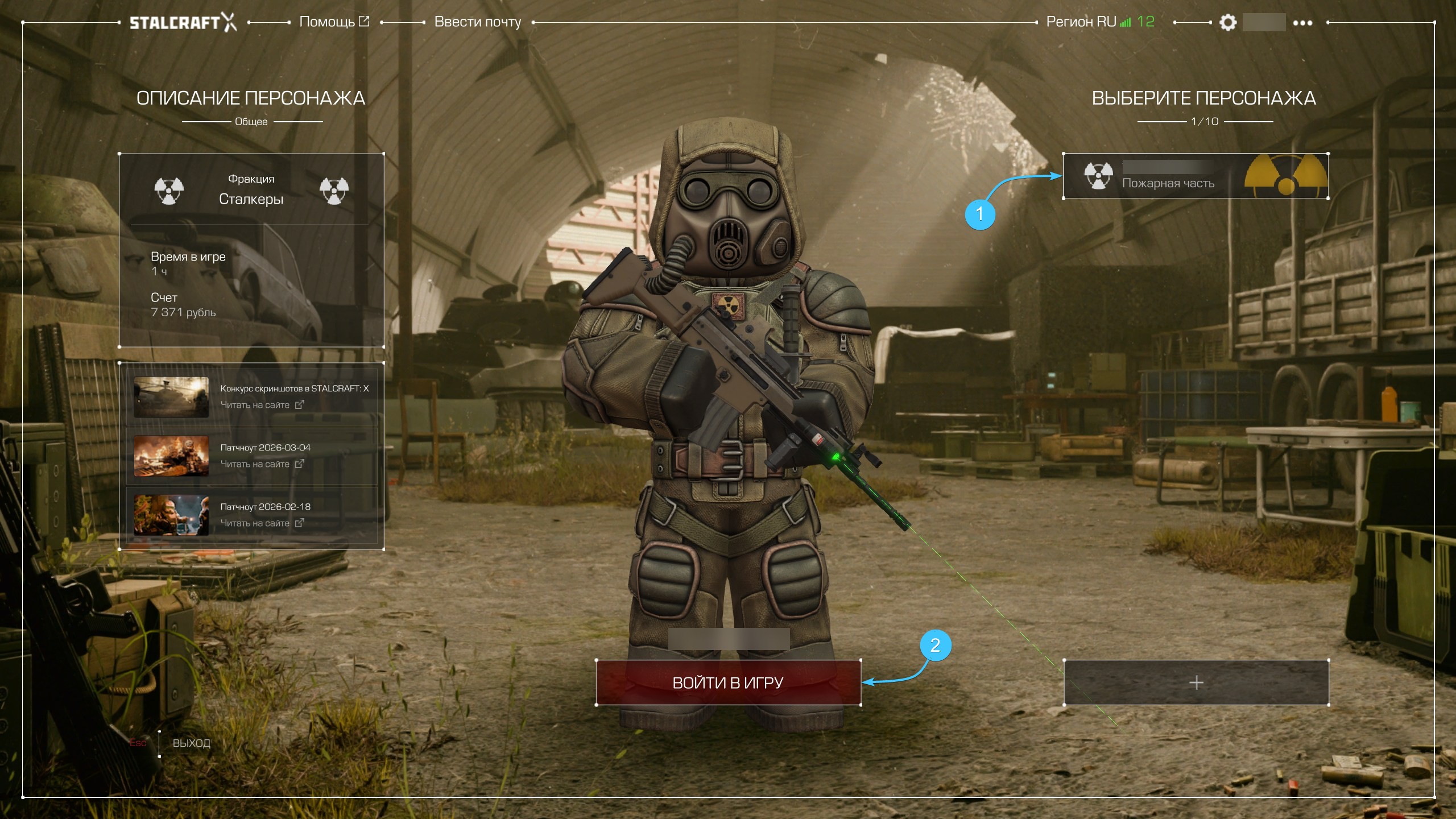 3. Запустите «STALCRAFT: X». В главном меню выберите необходимого персонажа и зайдите на сервер.