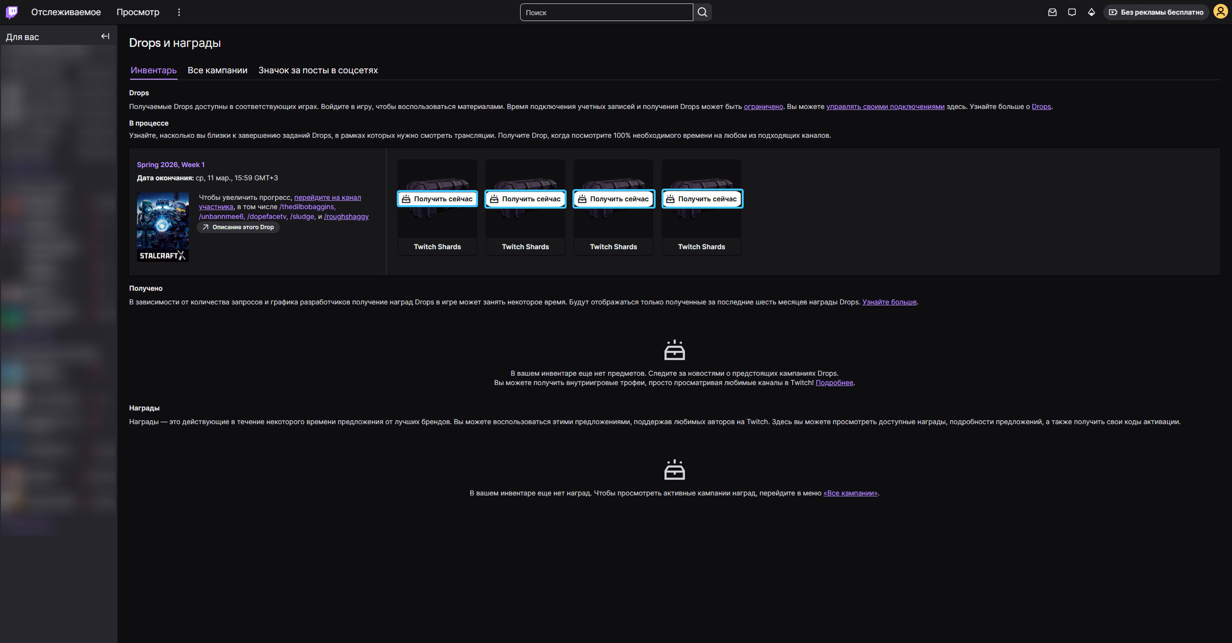 Награды «Twitch Drop» — это ценности, которые выдаются пользователям за просмотр определённого количества часов прямых трансляций по игре «STALCRAFT: X» на официальном сайте платформы «Twitch».
